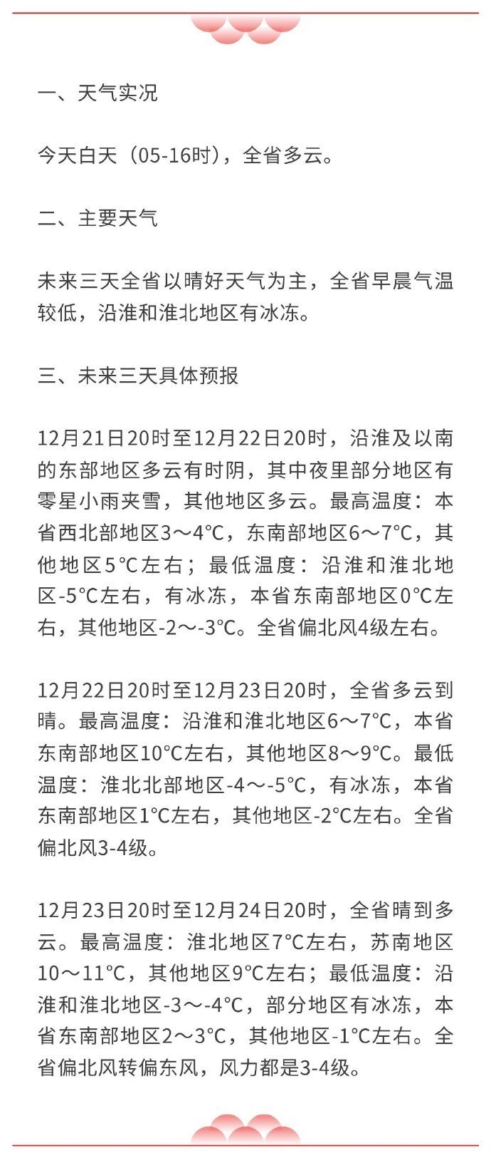 12月23日20时至12月24日20时,全省晴到多云。最高温度:淮北地区7℃左右,苏南地区10~11℃,其他地区9℃左右;最低温度:沿淮和淮北地区-3~-4℃,部分地区有冰冻,本省东南部地区2~3℃,其他地区-1℃左右。全省偏北风转偏东风,风力都是3~4级。