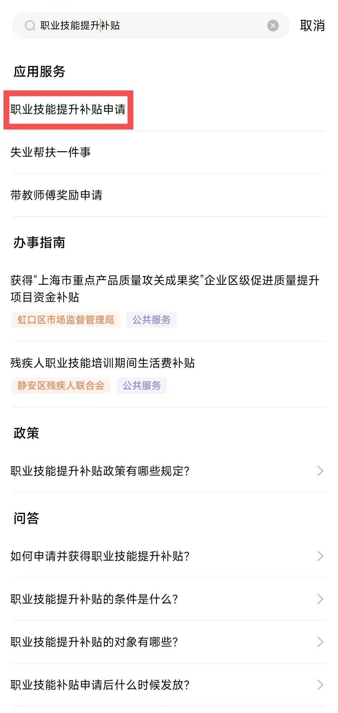 1、可通过“随申办市民云”APP首页搜索关键词“职业技能提升补贴”,选择“职业技能提升补贴”服务进行办理。