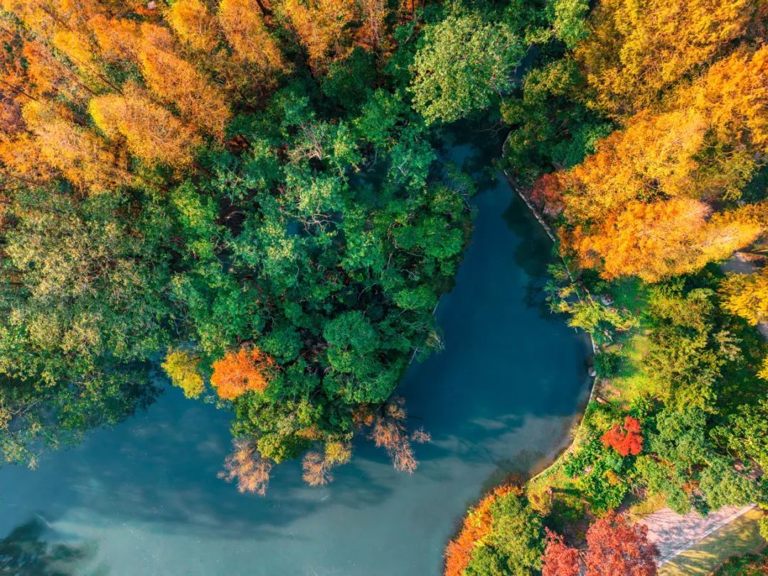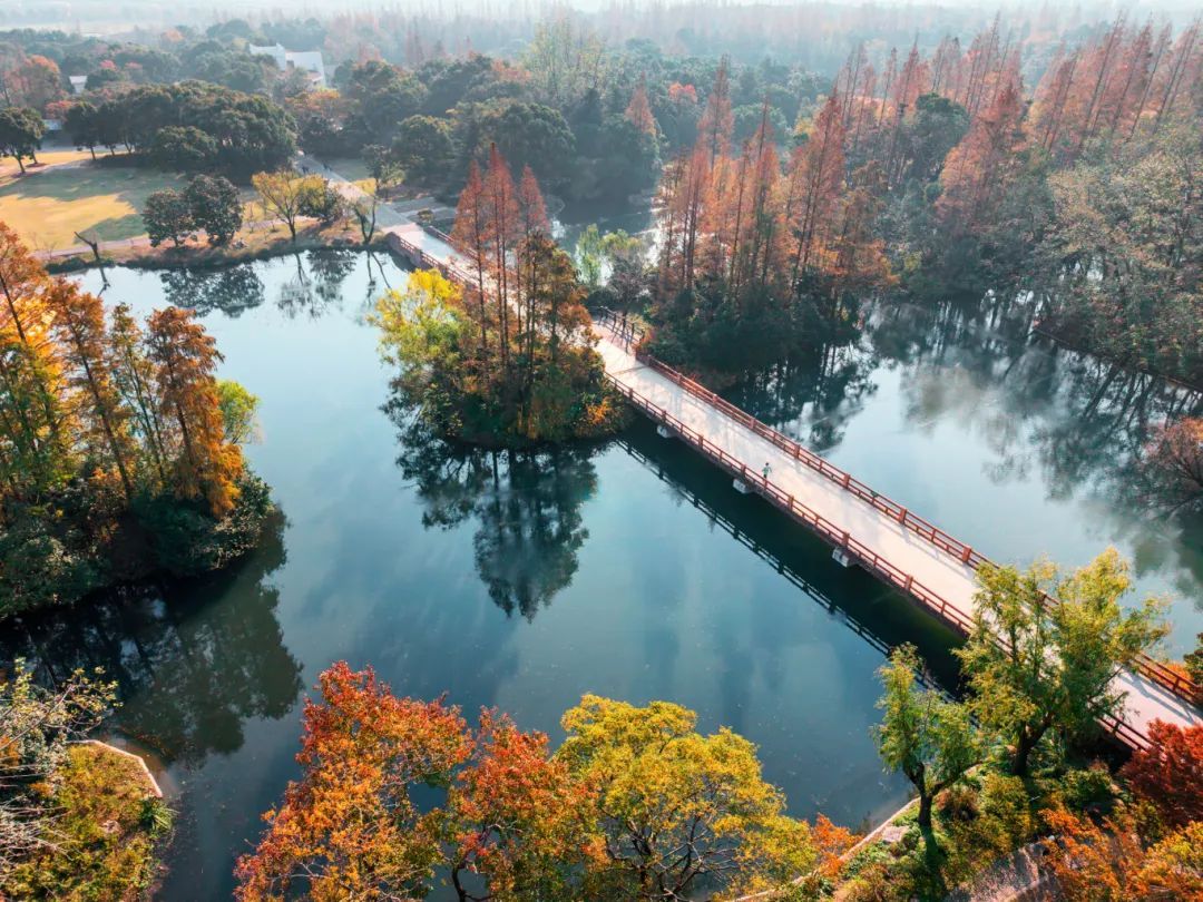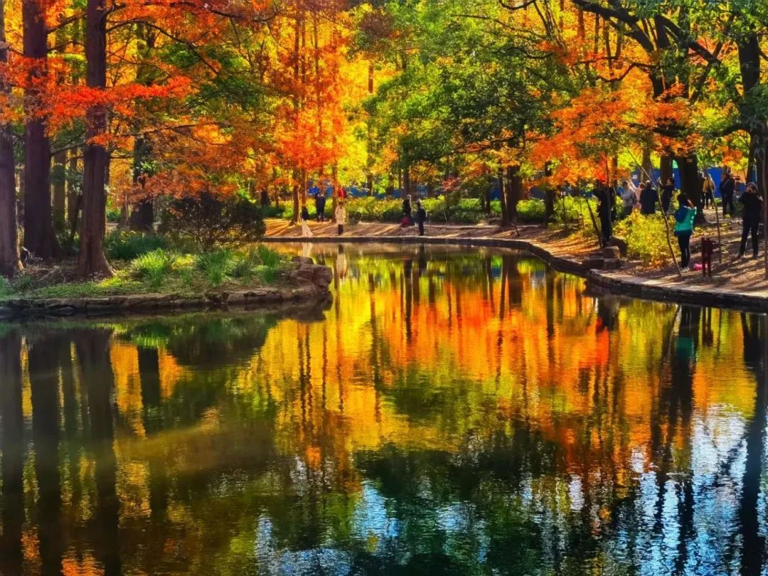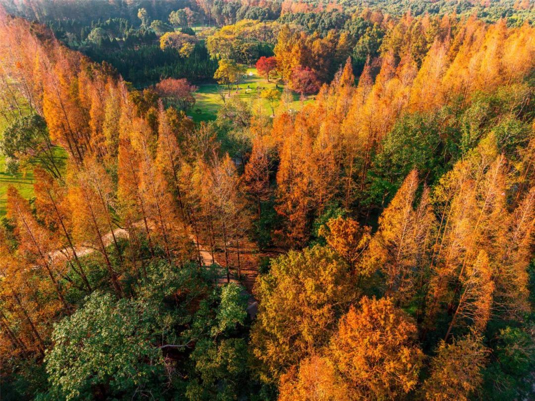作为申城赏景的传统胜地,共青森林公园内的水杉树同样是不可错过的打卡点。当阳光穿透稀疏的云层,洒在排列整齐的水杉树上,每一片叶子都仿佛被点燃了,闪烁着温暖而耀眼的光芒。漫步其间,仿佛步入了一个梦幻的童话世界。
