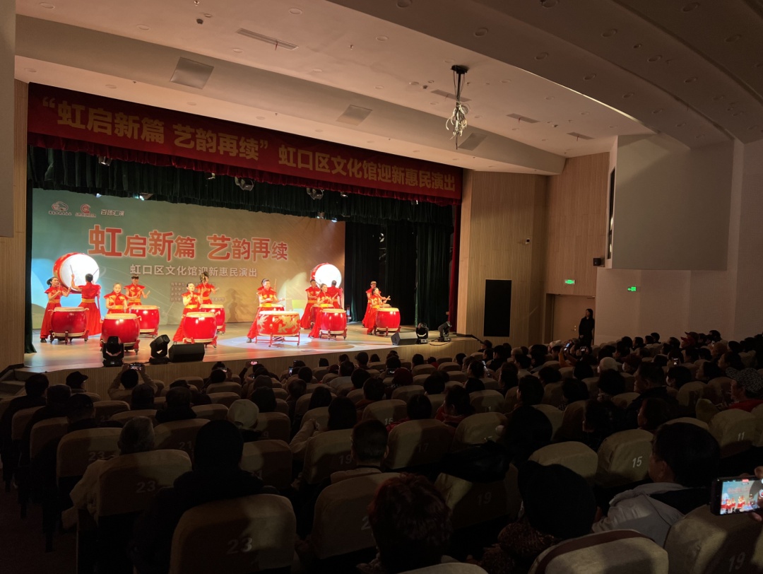 12月21日下午,鼓乐《鼓舞中华》激昂的鼓点声拉开了虹口区文化馆开馆后剧场的首场惠民演出。本次演出以“虹启新篇、艺韵再续”为主题,突出“百团汇演”,展现了近几年虹口公共文化成果和特色群众文艺团队孵化成效。