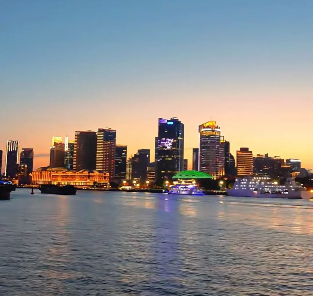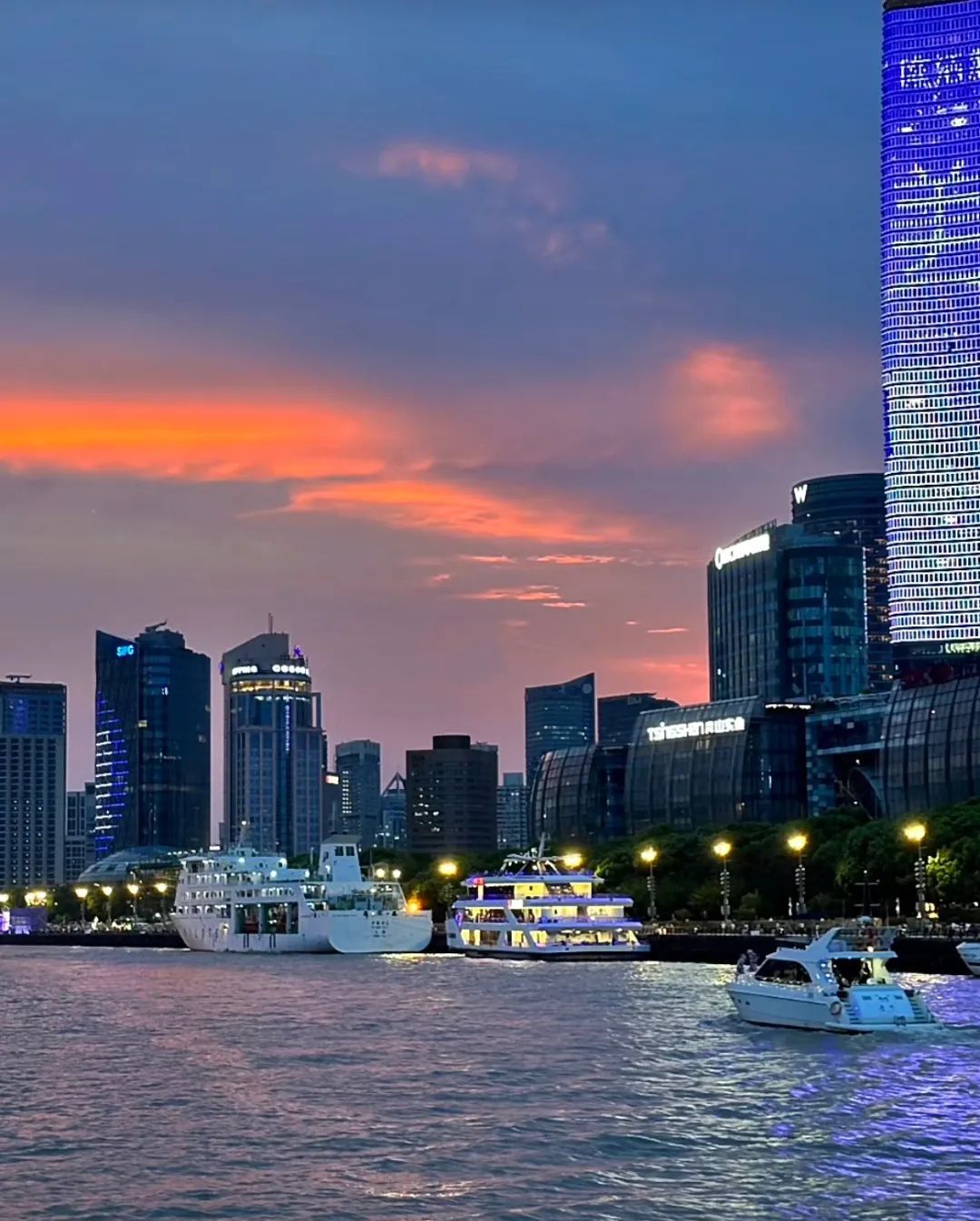 随着太阳缓缓下沉,天空像被施了魔法一般,渐渐染上了温柔的黄晕。晚霞的色彩如同调色盘般丰富,红、橙、紫交织在一起,美得让人心醉。此时,浦江两岸的建筑物仿佛也加入了这场视觉盛宴,世界会客厅、白玉兰广场等虹口地标建筑在晚霞的映衬下更显壮观。别忘了重新买票,这样就可以再次回到公平路轮渡口。之后,不妨沿着北外滩滨江来一场City walk吧!在晚霞的衬托下,北外滩的风景变得更加迷人。上海最近天黑得较早,小伙伴把握好时间哦~