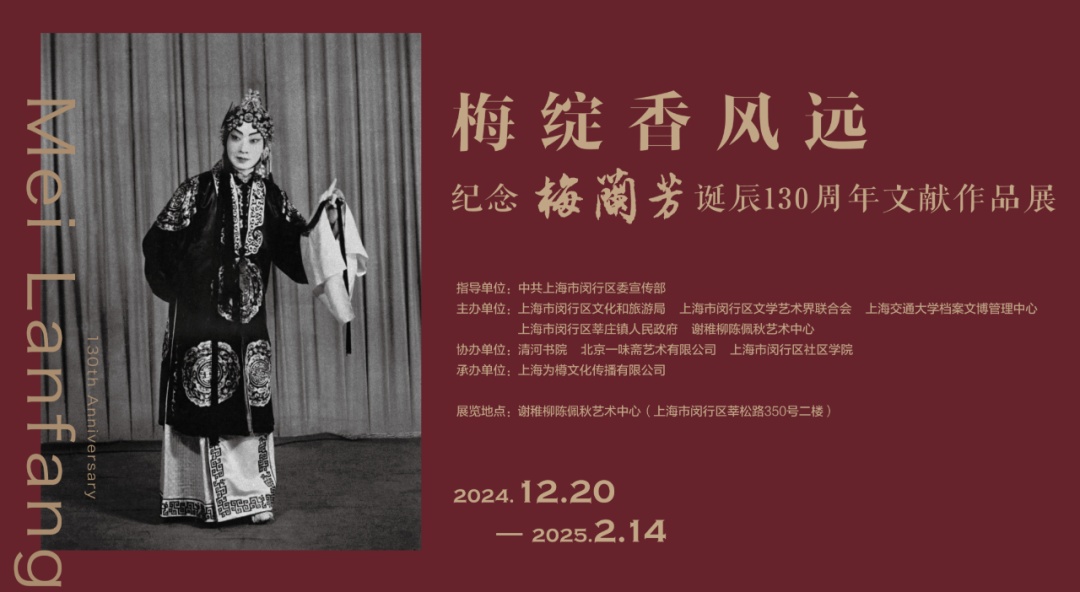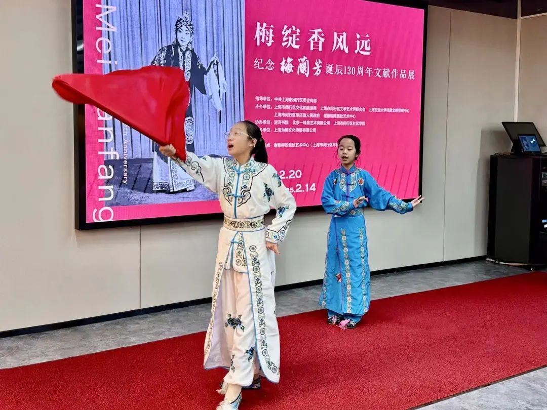 12月20日,“梅绽香风远”纪念梅兰芳诞辰130周年文献作品展在闵行区谢稚柳陈佩秋艺术中心开幕。本次展览聚焦梅兰芳舞台艺术,展出梅兰芳不同时期的珍贵剧照50余张,戏曲名家的书画、题词等重要文献及梅兰芳外孙范梅强创作的京剧唱词书法作品20余幅,梅兰芳的中国画作品也在此亮相。