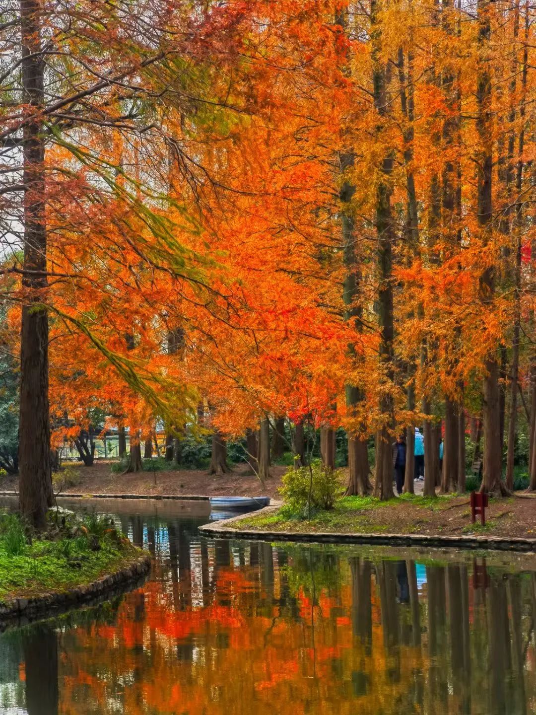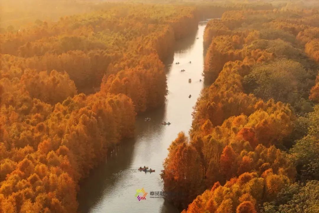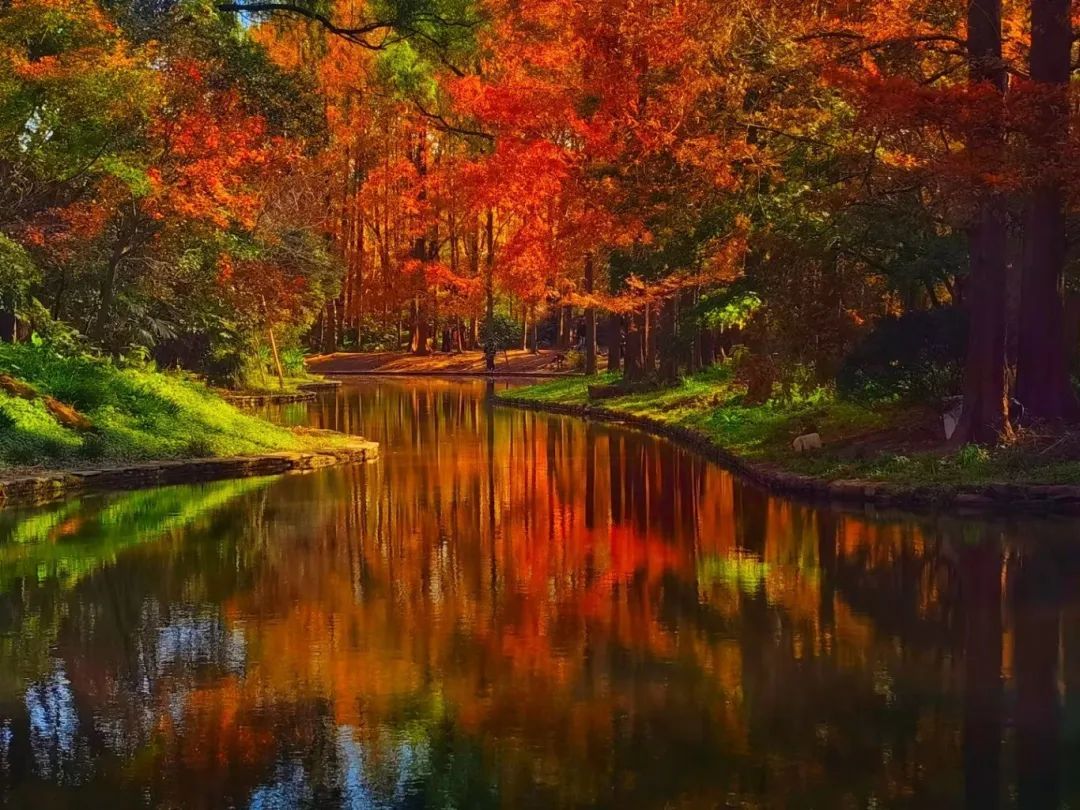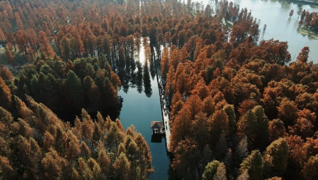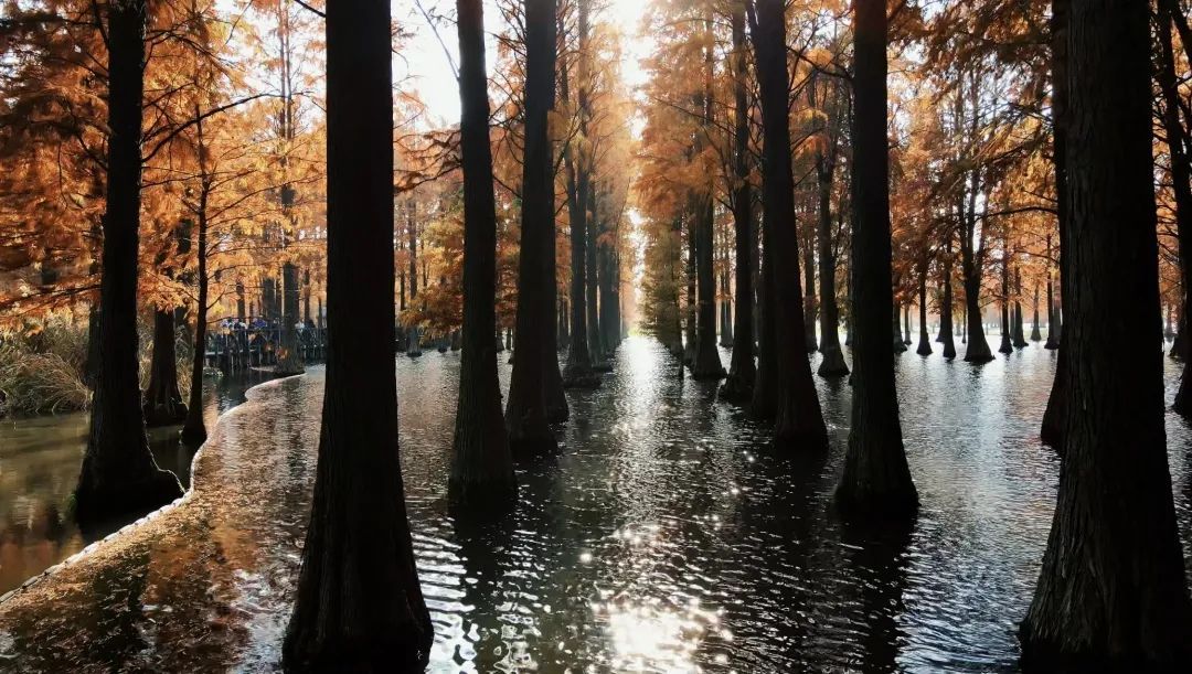 作为申城赏景的传统胜地,共青森林公园内的水同样是不可错过的打卡点。当阳光穿透稀疏的云层,洒在排列整齐的水杉树上,每一片叶子都仿佛被点燃了,闪烁着温暖而耀眼的光芒。漫步其间,仿佛步入了一个梦幻的童话世界。