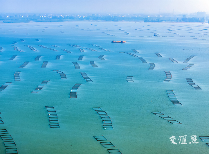 6月30日,连云港东海县境内的石梁河水库,一个个网箱错落有致地排列在清澈的湖水中,小船、小屋、网箱构成一幅美丽的风景画。邵光明 摄