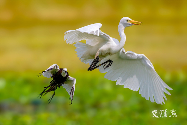 9月12日,泰州千垛镇苏宋村,水雉和白鹭争地盘,经过十多分钟“决斗”,白鹭被驱赶出这片“领地”,获胜的水雉在水面上空快乐飞翔。赵海洋 摄