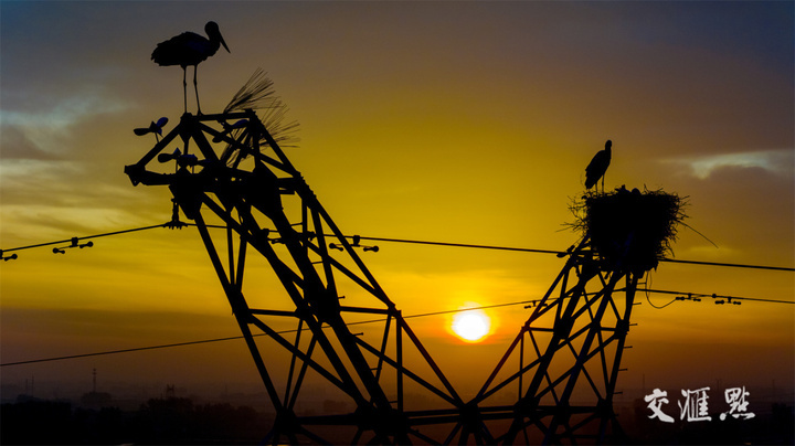 4月19日,扬州高邮界首镇大昌村一座40米高的输电铁塔顶端,处于孵化幼鹳期间的一对东方白鹳夫妻在夜幕降临之际分工明确,一只外围警戒,一只守着幼鹳。吴俊 摄