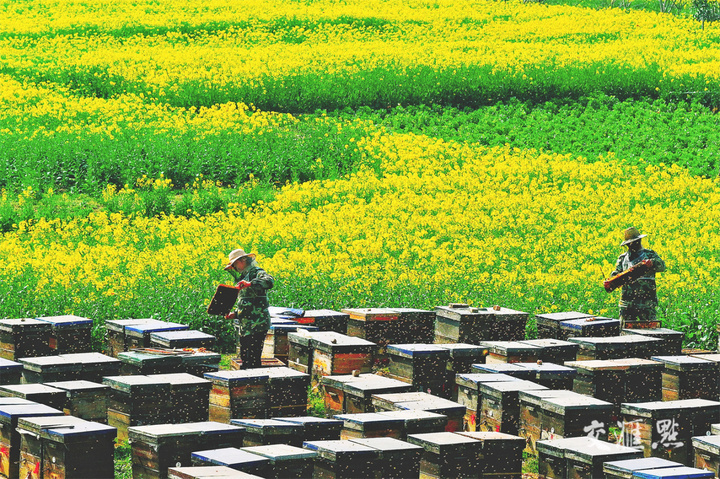 3月19日,南通长江镇平南社区一片盛开的油菜花地,来自吉林省蛟河市的养蜂人在查看蜜蜂采蜜情况。乡村田野油菜花竞相盛开,正是蜜蜂采蜜的好时节。吴树建 摄