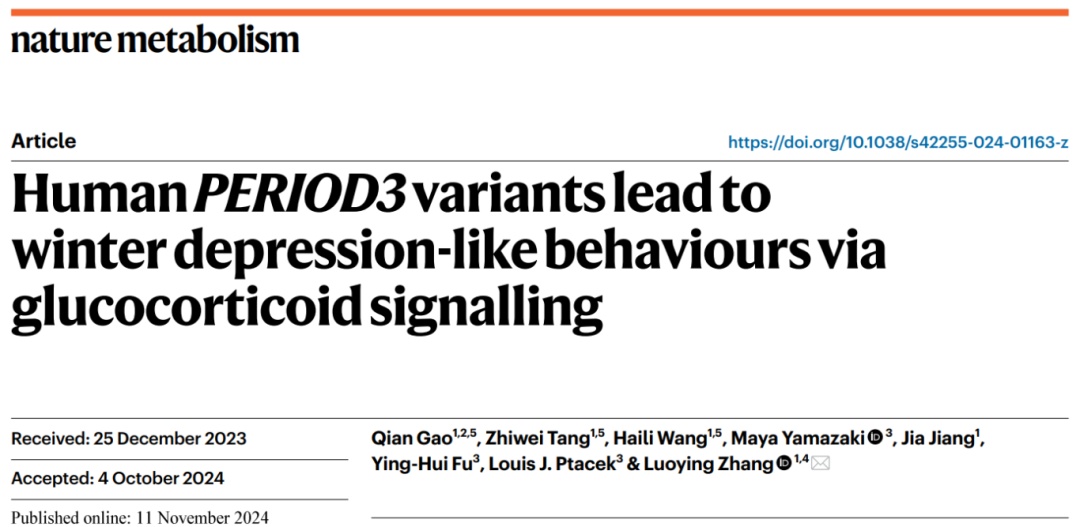 近日,华中科技大学生命科学与技术学院张珞颖教授团队在《Nature Metabolism》杂志上发表了题为“Human PERIOD3 variants lead to winter depression-like behaviours via glucocorticoid signaling”的文章。科学家们发现,人类生物钟基因PERIOD3的一种变异(PER3-P415A/H417R)在模拟冬季日照减少的情况下,会增加一种压力激素——糖皮质激素的分泌,从而导致类似抑郁的行为。