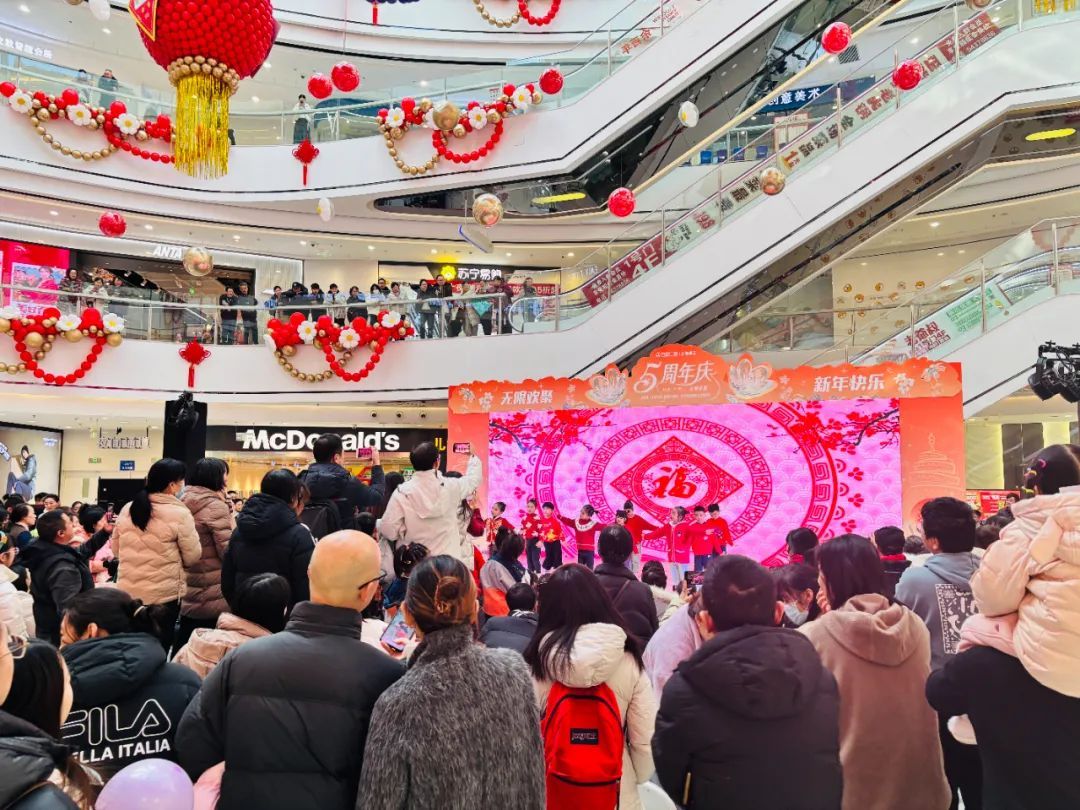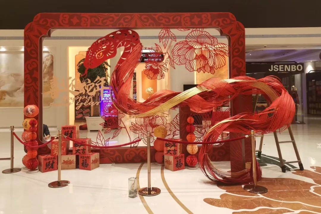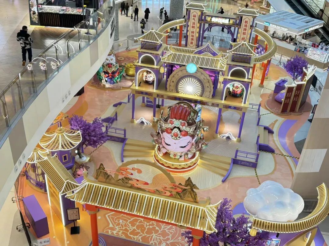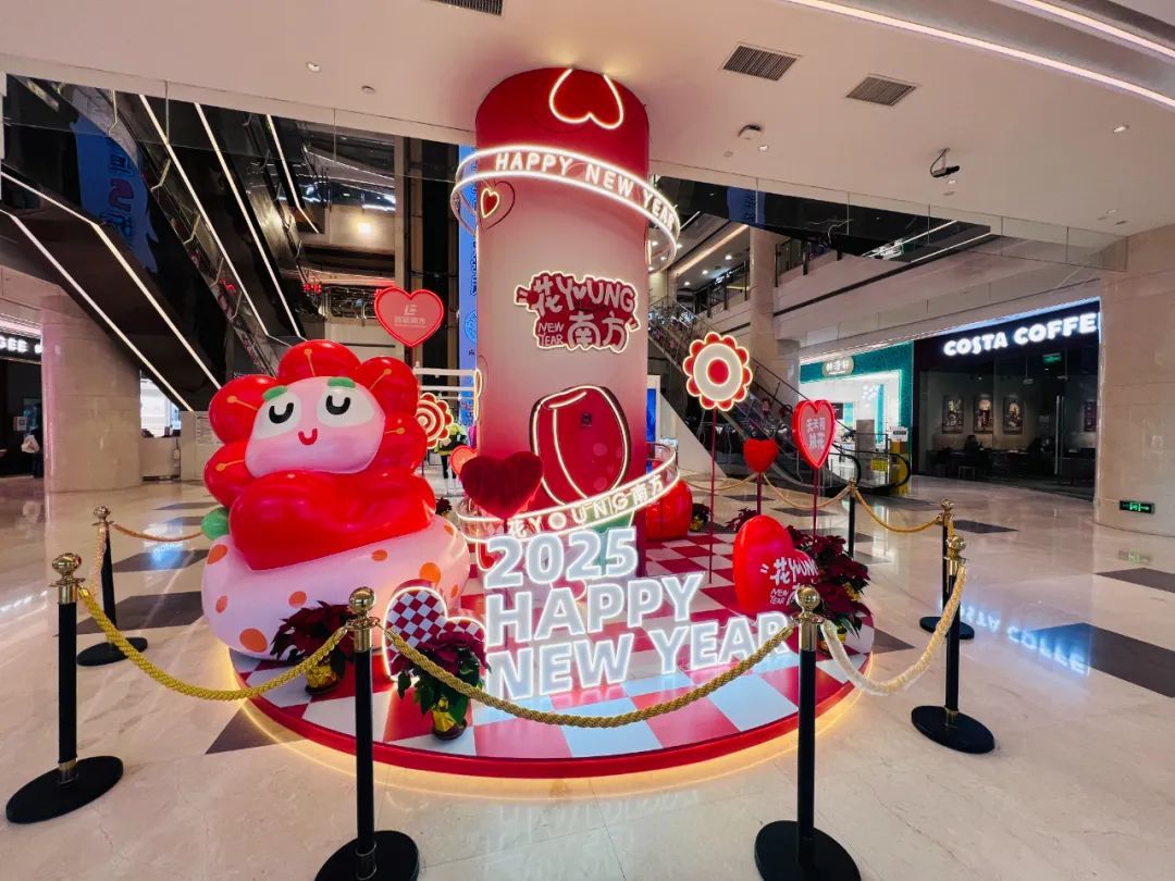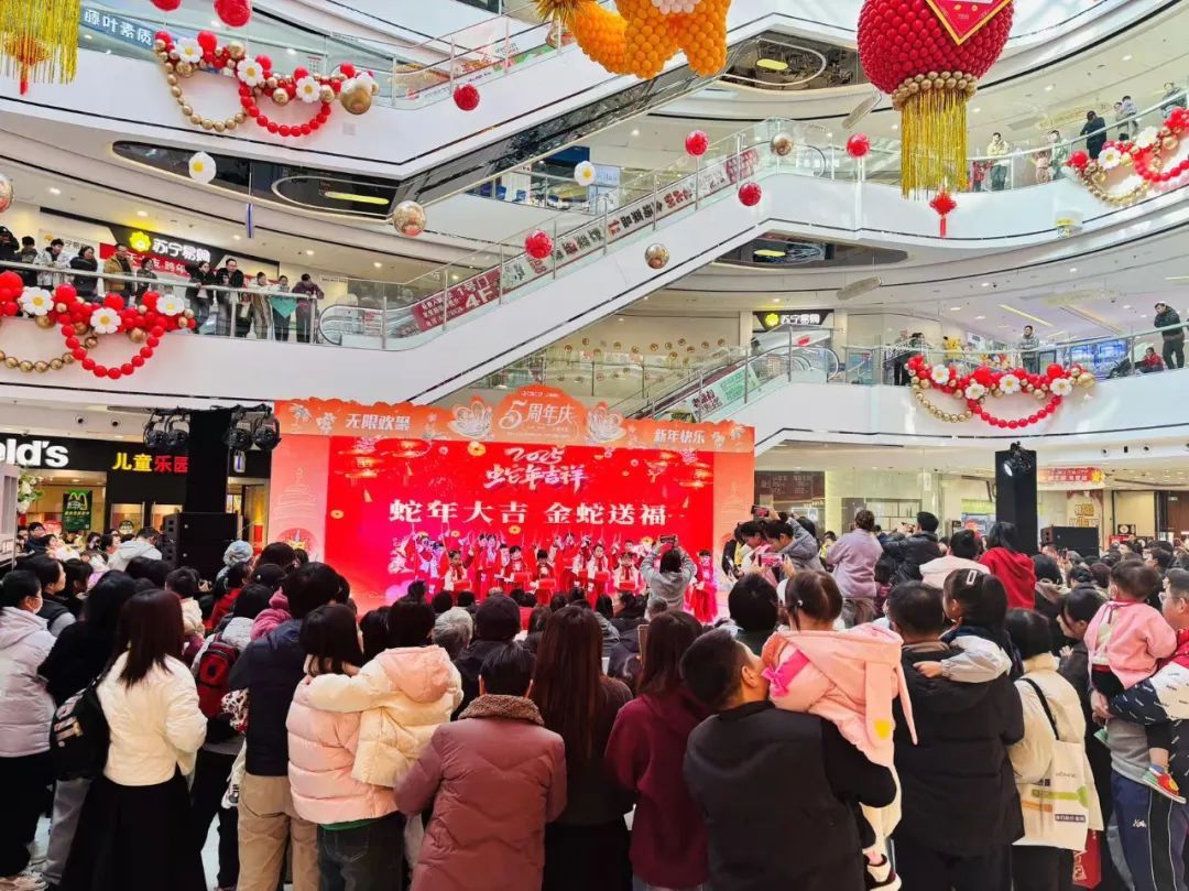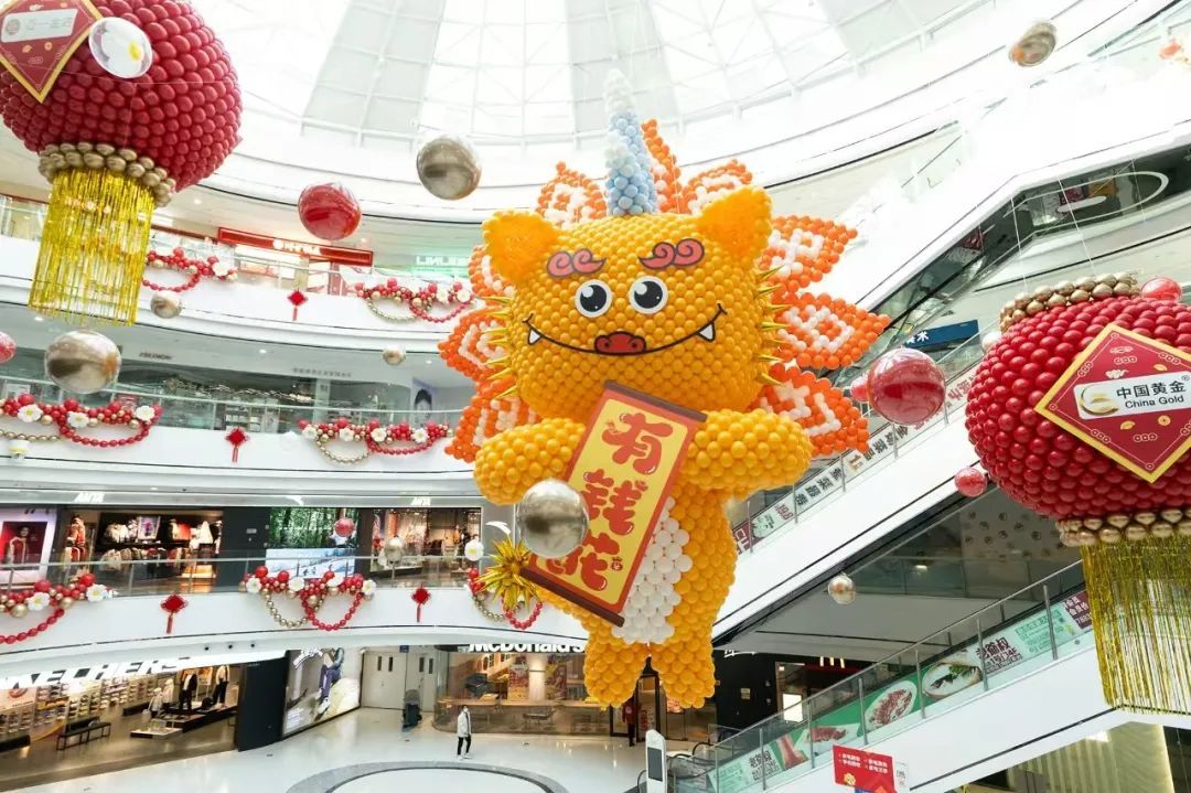 龙茗路上的十尚坊、古美生活广场等居民家门口的商圈也挂上了红灯笼,带来了满满的年味,共同迎接2025年的到来。七宝宝龙城的节日装置“新满意竹”以“中国红”为核心元素,巧妙融合竹编这项非遗民俗形式,将传统与新意交叠环绕,营造出浓郁的节日氛围。2025年“年宵花市”活动与国潮IP福福贴贴联动合作,打造紫金色系的节日场景,设置高互动性点位及饱满的空间感造景,吸引更多年轻客群和七宝老街的游客。中环吴中路口和宋园路吴中路口的树上挂上了红色和黄色的灯笼,迎接着来到虹桥的人们,也照亮了人们心中的喜悦。合川路金虹桥公园内,灯笼高挂,漫步其中,充满温馨与节日氛围。虹梅路老外街西门,一串串彩灯如彩带般悬挂,与中国结相互映衬,为这条充满国际风情的街道增添了几分传统韵味。江川路街道的“红园侨之家”旁的广场上人来人往,人们或是张望,或是执笔而立,一张张寄托了祝福的春联在笔下形成,刚写好墨迹未干的春联被晾在一旁,与高高挂起的红灯笼相映生辉,处处洋溢着欢乐与希望的气息。联航路路口处通过更换了颜色鲜艳的冬季草花,营造出繁花似锦的节日氛围,并在两侧增加了中国结、红灯笼、剪纸等中国传统元素,喜气洋洋。浦江万达新年新气象,跨年迎艺术嘉年华,萌娃汇演嗨翻天,8米巨型獬豸气球展,喜气洋溢了整个新年。踏入南方商圈,新春的气息扑面而来。南方连廊上高挂的串串红灯笼摇曳生姿,喜气洋洋。百联南方购物中心里,“花YOUNG南方”装置布置及迎新活动吸引着众人目光,卡通花朵笑容满面,新年喜悦跃然眼前。