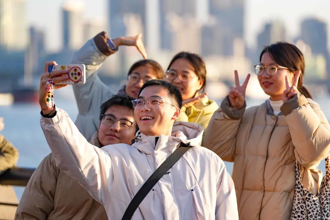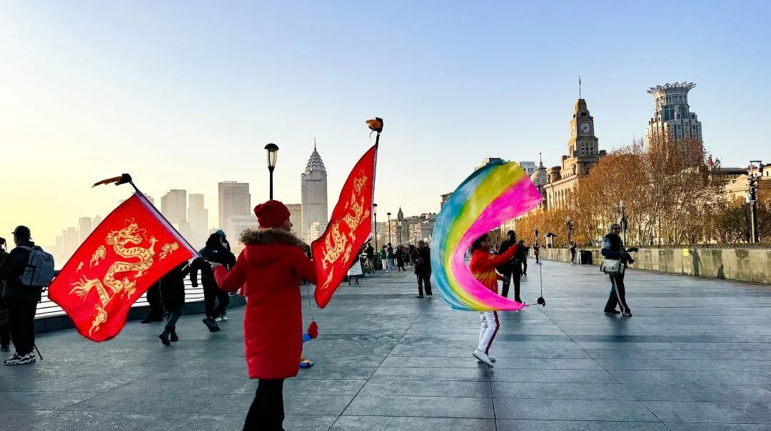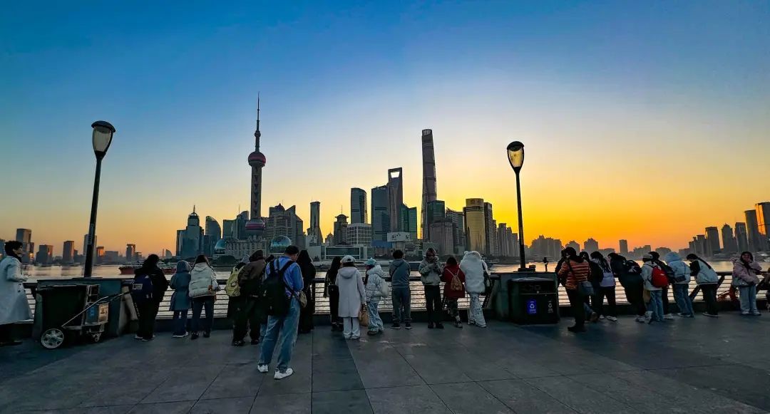 2025年1月1日,上海外滩,众多上海市民和来自世界各地的游客在清晨的微光中聚集,随着第一道曙光破晓,他们心中充满了对新年的期待和喜悦。