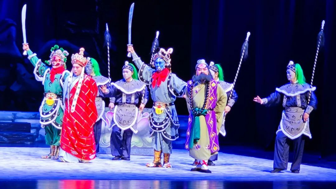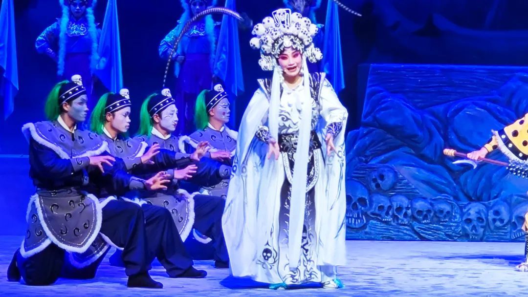 “现本相,朽骨一丘……”晚上7时30分,随着“白骨精”一声响亮的开嗓,大剧准时开演。只见演员威风凛凛地站在一米多高的山头上,华服加身、雉翎抖擞。突然她双手遮面,瞬息间,白脸白袍变成红色;又一转身,红色变为蓝色;再一扭头,蓝色变回白色。不到一分钟,演员完成三次变脸和变装,引得现场观众连连惊叹,也掀起了演出的高潮。“太精彩了,没想到婺剧中也有变脸,今天真是不虚此行。”当天特意赶来看剧跨年的上海交大学生程欣宇说道。