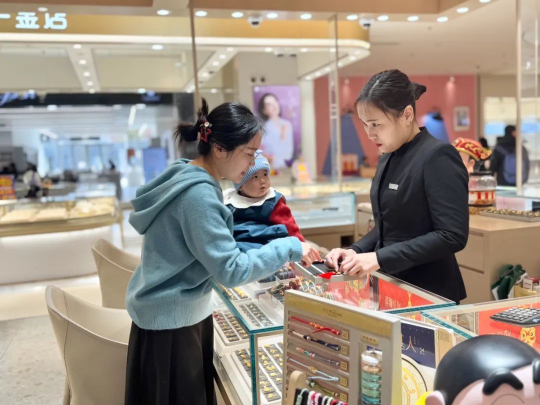 九亭金地广场多家商户门口人头攒动,其中,汇集了众多黄金珠宝店铺的广场一层,成为不少市民的首选。“宝宝快满一周岁了,打算买一个小挂锁,希望宝宝平安喜乐。”市民石朝慧抱着宝宝前来挑选黄金饰品。新年前后,黄金消费迎来旺季,商场联动多家金饰商户推出以旧换新、让利折扣、黄金克减等活动,克价最高可减免120元。