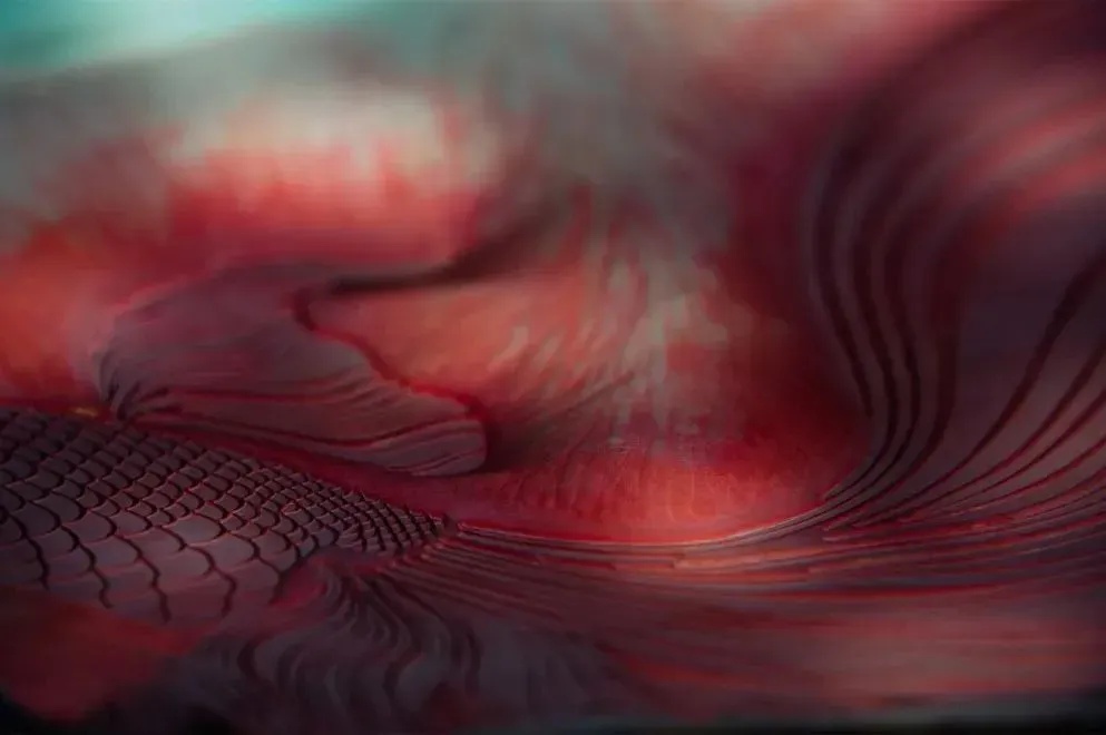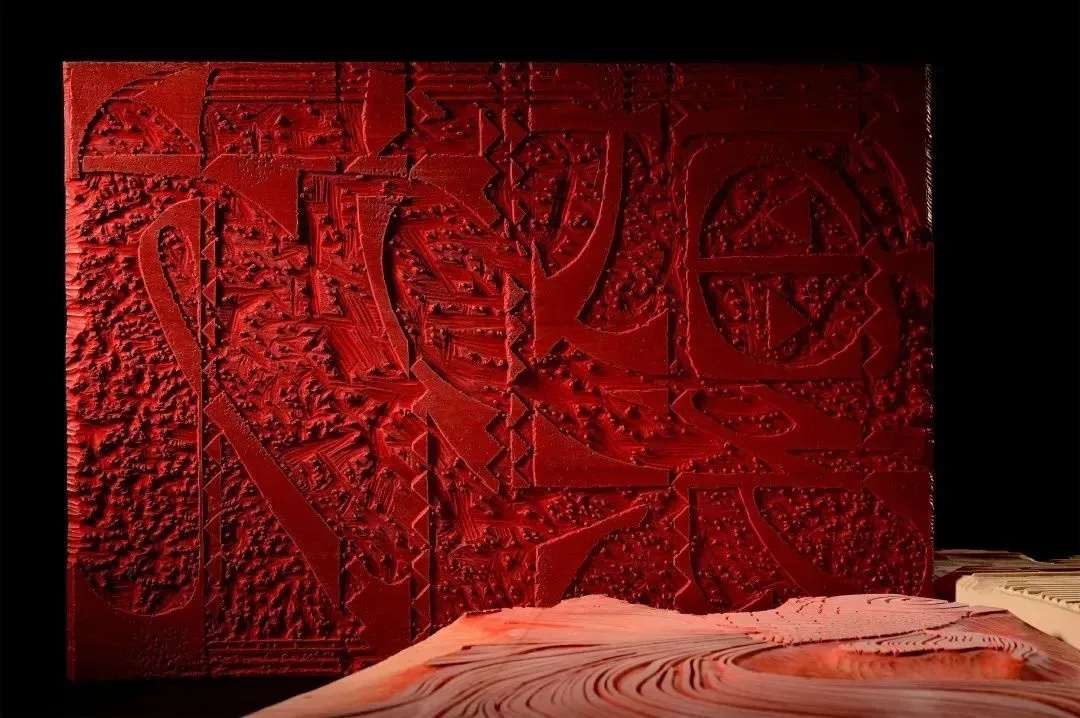 《绛云》探寻传统工艺的极致可能。近两米的巨版套印全面挑战工艺极限,颜色以朱砂、胭脂虫等珍贵传统国画颜料研配,在朵云轩库藏的手工宣纸上,呈现出浓醉沉酣的红。