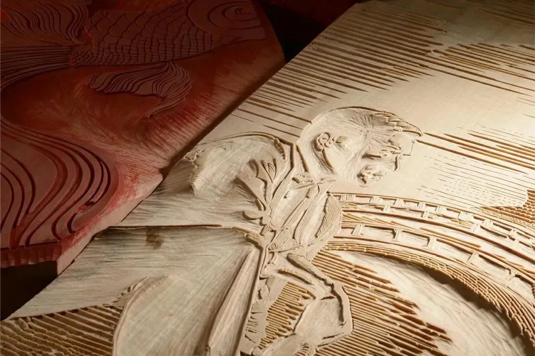 共创作品以剧集《繁花》的两张木刻版画风格的海报为基础,以传统木版水印技艺对其进行远超常规尺幅的再现。有意思的是,“繁花”二字的字体风格正源于鲁迅先生的设计,正所谓“念念不忘,必有回响”,这一声“响”跨越百年,意义非凡。