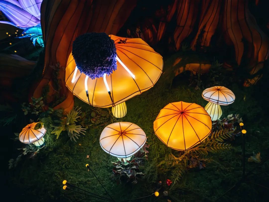 “山海奇妙生机勃发,万物美好不负韶华”中心广场呈现“天地人和,金蛇献瑞”的热闹丛林景象,金色灵蛇盘绕在蘑菇丛林中,灵蛇的身躯仿佛成了一道流动的彩带。除了巨大的金色灵蛇,它身上渺小的菌人和其他组别小蛇同样值得关注,小菌人出自《山海经》:“有小人,名菌人。(菌通郡)古训载:海人生若菌,若菌生圣人。”小菌人如小蘑菇般身形,有着乐天从容的性格,表达对美好生活有追求。