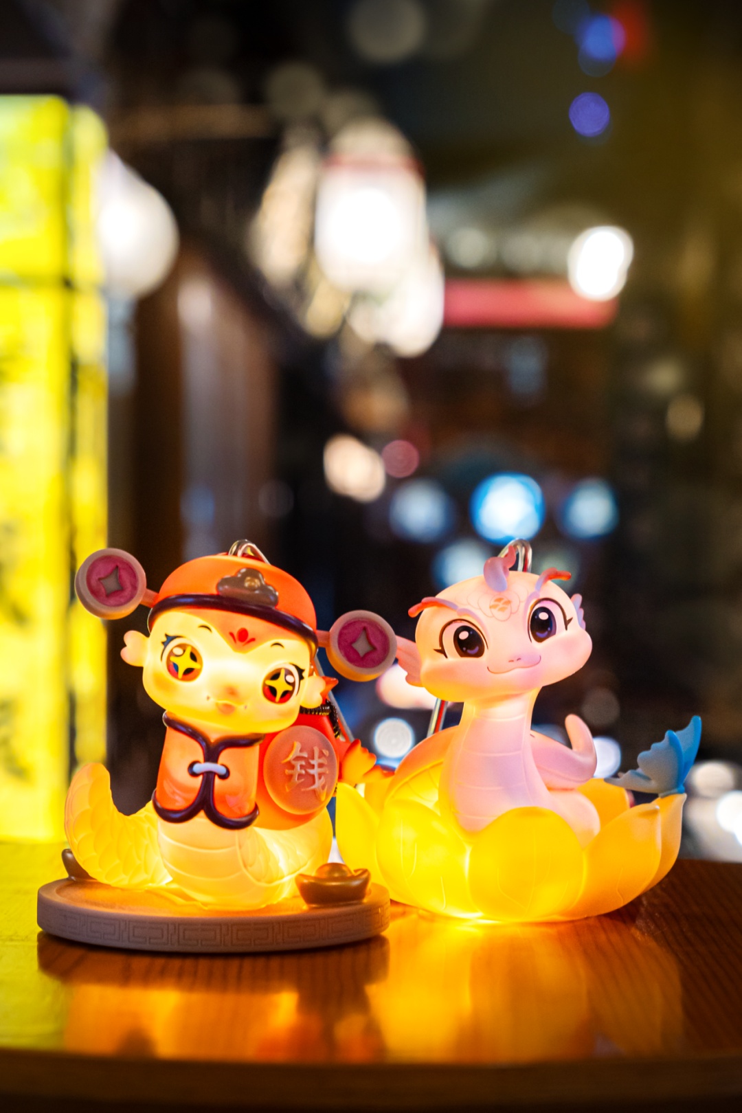 豫园爆款文创灯笼每年都不会缺席,今年依然有灵蛇秘境、多福多金2款提灯,带着好运而来。灵蛇秘境-灵蛇彩莲提灯设计来源于中心广场灯组,灵蛇从天而降盘旋于彩莲之上,还有“庄周梦蝶”灯组中蝴蝶元素点缀,寓意“好运莲莲”;多福多金-灵蛇财宝提灯采用财神+钱币+蛇宝宝的造型,打造祥瑞之蛇,凝结了中国传统文化中对幸福、健康、财富的祝福。中国自古就有元宵提灯的传统,有了2款福瑞满满的提灯加持,祈愿新年风调雨顺、幸福安康。