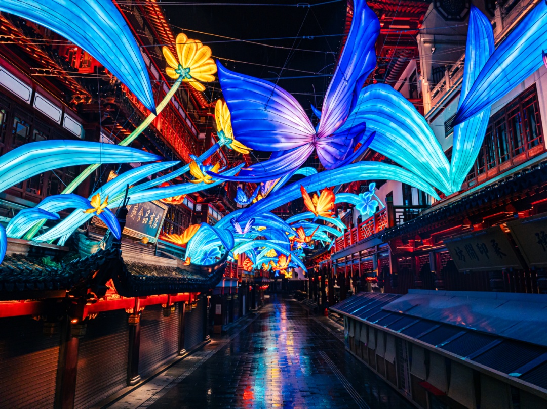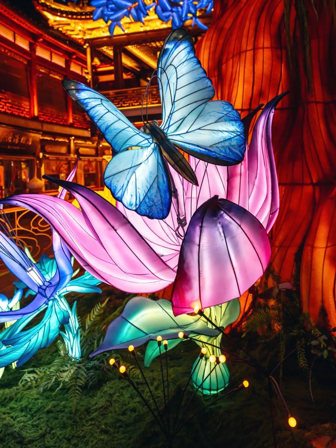 凝晖路今年依然是豫园灯会“最热打卡点”之一。茂密藤蔓环绕,无数色彩斑斓的蝴蝶自谷底向天空聚集,翩翩起舞,形成炫彩夺目的蝴蝶花海,从凝晖路一路走来,乘蝶以游,模糊了人与蝴蝶的界限,营造出“逍遥物外,庄周梦蝶”的梦境,达到“人在灯里游”的感受。