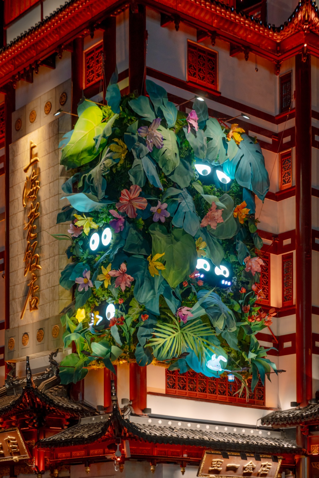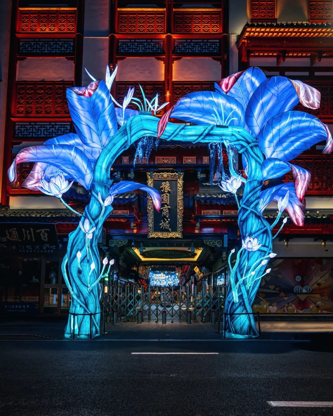 在新年之际,豫园灯会的四大穿越之门开启。从二号门“莽浮秘境,生命之门”进入的游人们,可随豫园灯会推荐路线步入黄金广场。广场中心生长着一颗生命之树,作为丛林中的长者,它见证并记录了整个丛林的生机与繁茂。