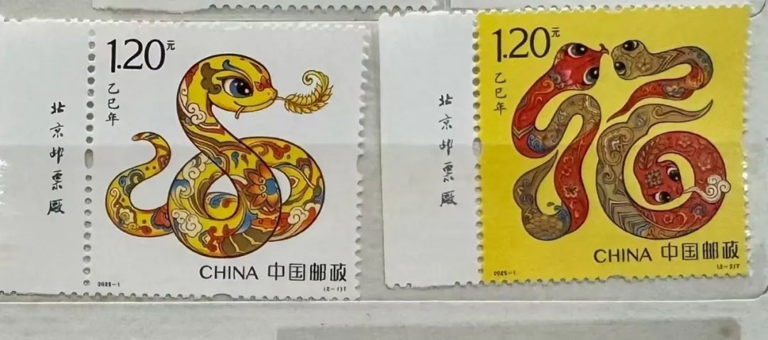 方寸之间沉淀着中华文化,记录着沧海变幻。《乙巳年》特种邮票一套两枚,第一枚图名为“蛇呈丰稔”,盘蛇意象灵动,金色的蛇躯蜿蜒,绘就了一幅丰收时节的美丽画卷。第二枚图名为“福纳百祥”,画面以草书笔意将三条蛇创意性地构成了“福”的字形,寓意和合共生、福满人间。