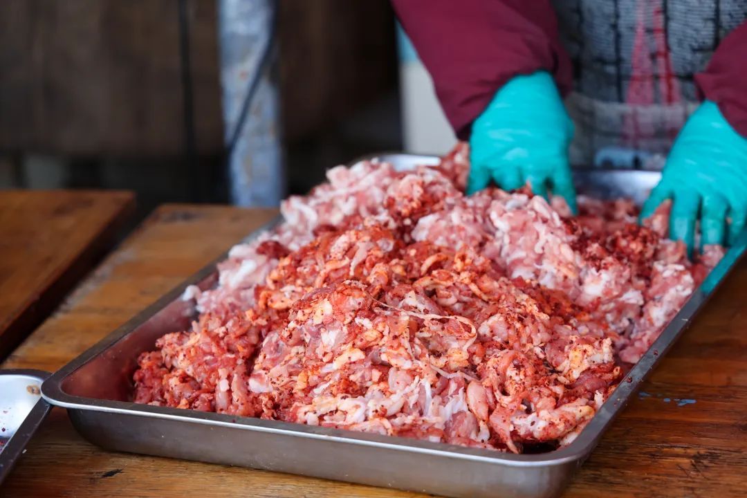 店主李惠娟正在忙碌地灌制香肠。她告诉记者,冬月是灌制香肠的好时候,今年她精心挑选了肥瘦适宜的新鲜夹心肉,制作了五香、麻辣、广式等多种口味的腊肠。由于新春将近,市民需求量渐长,她平均每天要灌制四五十斤肉。