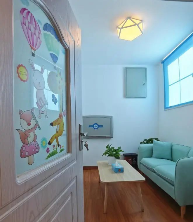 卡通贴画和磨砂玻璃膜为母婴室提供了良好的私密性,同时,入口处的可移动指示牌能够告知该空间的使用状态。母婴室虽然不大但是“五脏俱全”,专业母婴护理台、沙发、空调、茶几等应有尽有。