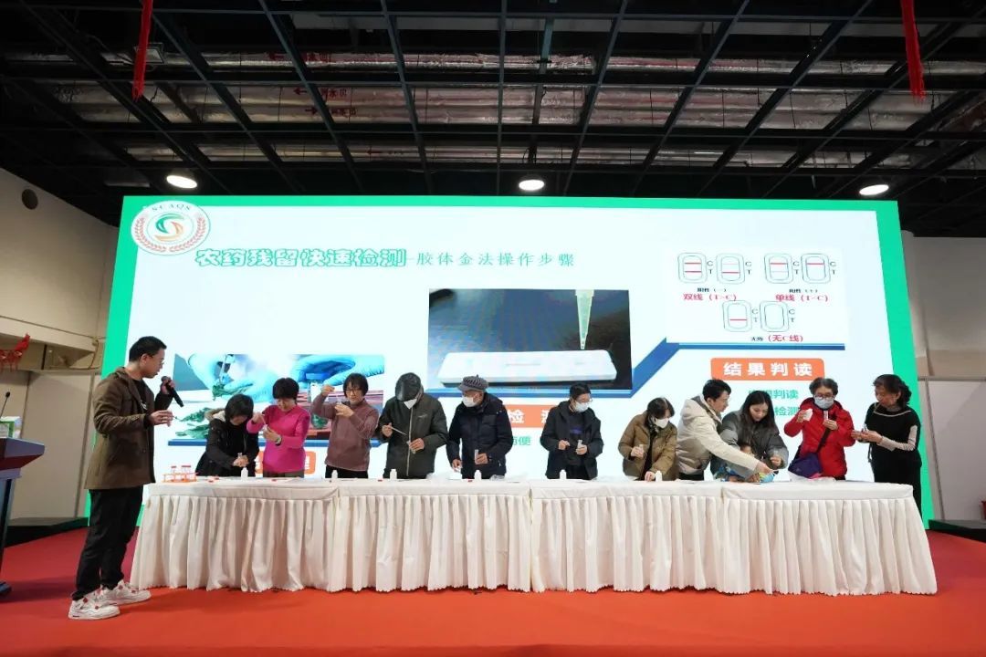“农药残留快速检测实验演示互动”环节将现场气氛推向了高潮。十余位市民被邀请上台,亲手操作进行农残快检。工作人员将新鲜采摘的蔬菜样本放上实验台,带领着市民,经过“样品处理”“检测”“结果判读”等流程,最终根据试剂盒结果来判定该农产品是否有农药残留。