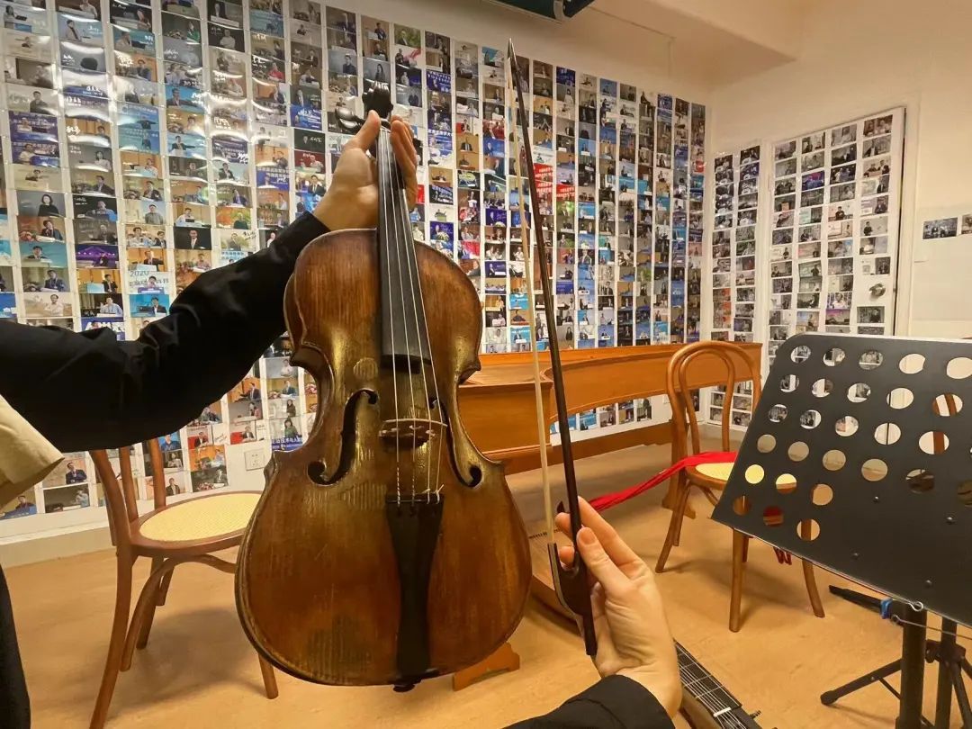 据悉,现场演奏的两件乐器已有百年历史。其中一件就是来自1751年的小提琴,它的构造就与现在的有很大差异。小提琴音乐家玛丽·纳多-特伦布莱向记者介绍道:“百年前的小提琴和现在的小提琴有几处不一样的地方,比如以前的弓是比较短的,琴弦材质不一样,以及不需要腮托和肩垫。”