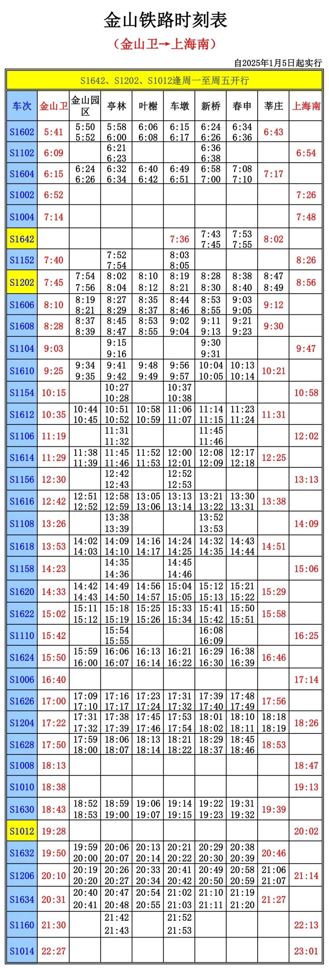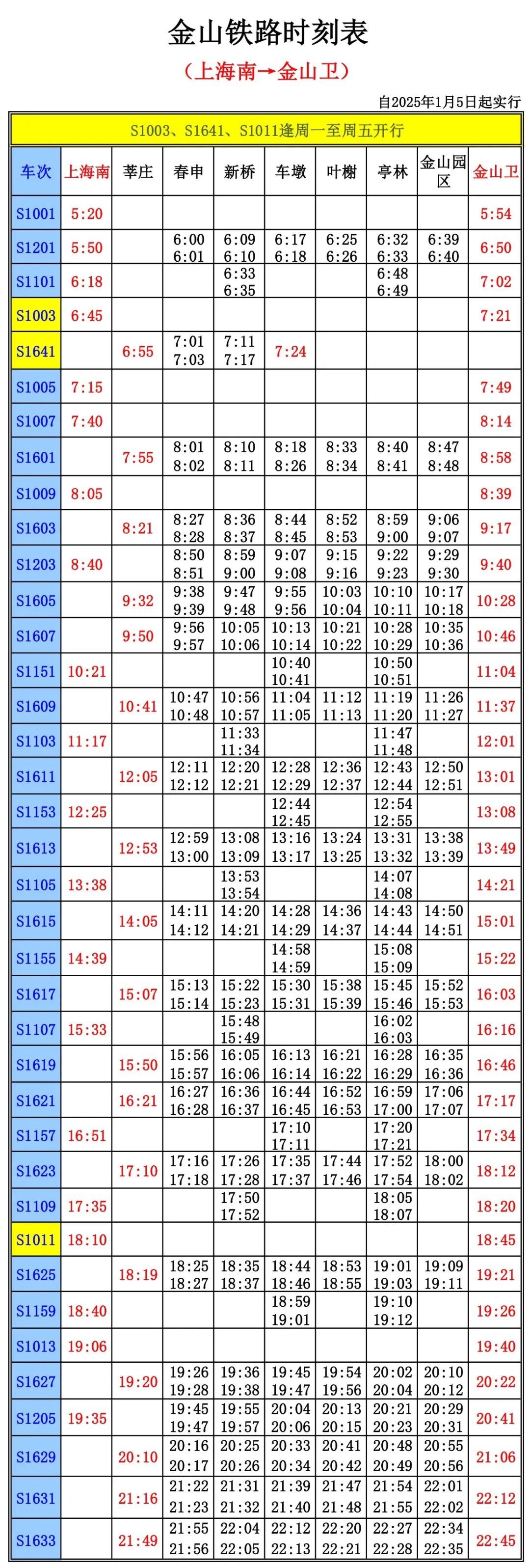 工作日早上9点前,金山卫站发来的列车一共有三趟终到站是莘庄,时间分别是6:43、7:17、8:02。