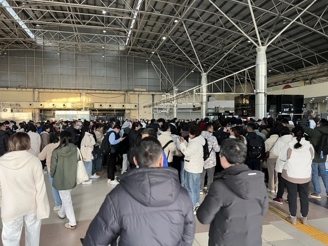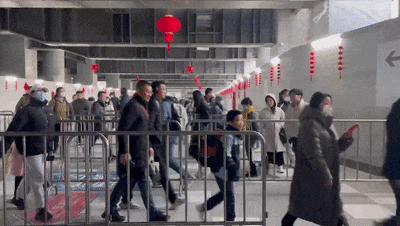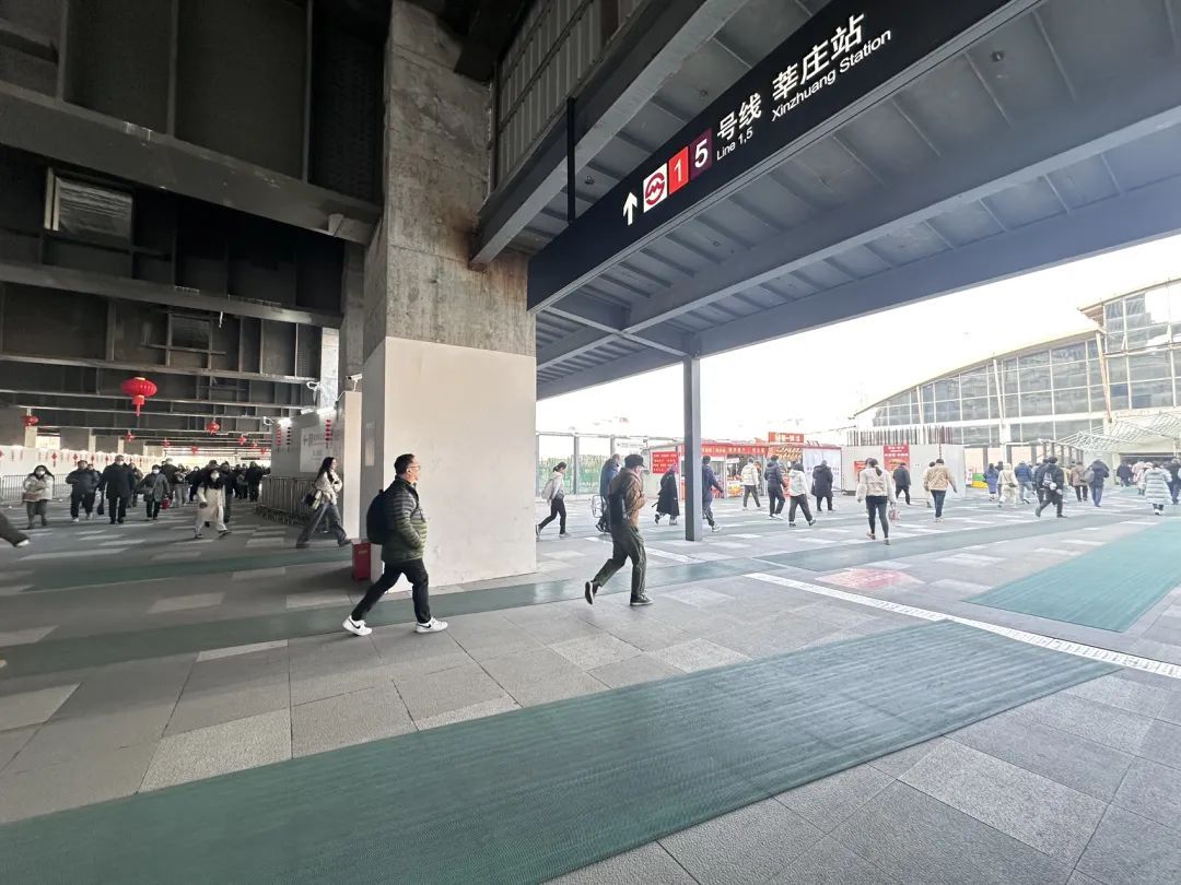 7:17,S1604列车抵达,约600人到站。记者在现场看到,旅客出了火车站,可以顺着长通道抵达地铁莘庄站南广场的天桥,然后走二三十米进站换乘地铁。为防止换乘铁路旅客在地铁站内瞬时大量积压,现场通过铁马设置蛇形通道对旅客进行限流,确保旅客有序进站换乘,减少拥挤、踩踏风险。