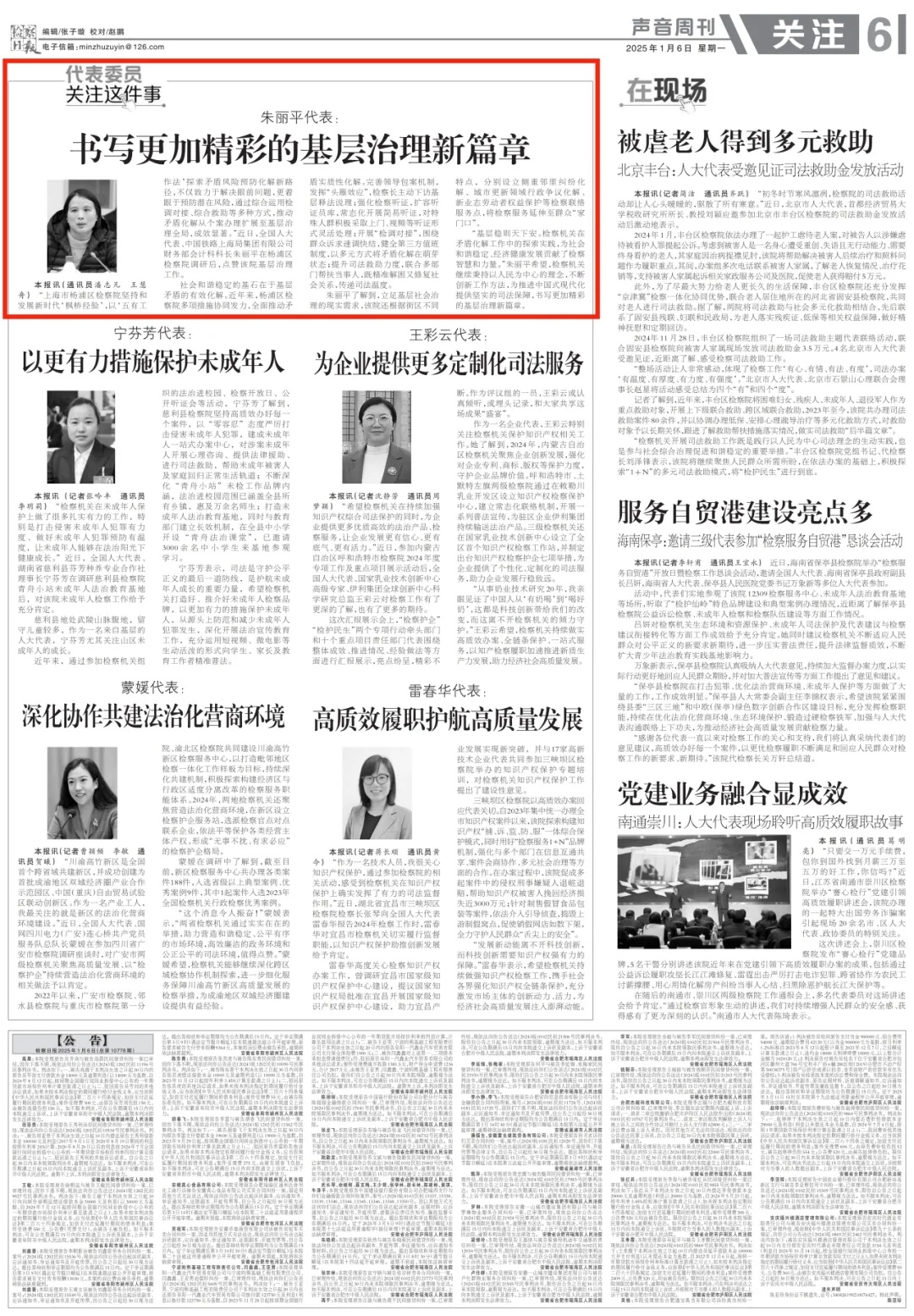“上海市杨浦区检察院坚持和发展新时代‘枫桥经验’,以‘五有工作法’探索矛盾风险预防化解新路径,不仅致力于解决眼前问题,更着眼于预防潜在风险,通过综合运用检调对接、综合救助等多种方式,推动矛盾化解从个案办理扩展至基层治理全局,成效显著。”近日,全国人大代表、中国铁路上海局集团有限公司财务部会计科科长朱丽平在杨浦区检察院调研后,点赞该院基层治理工作。