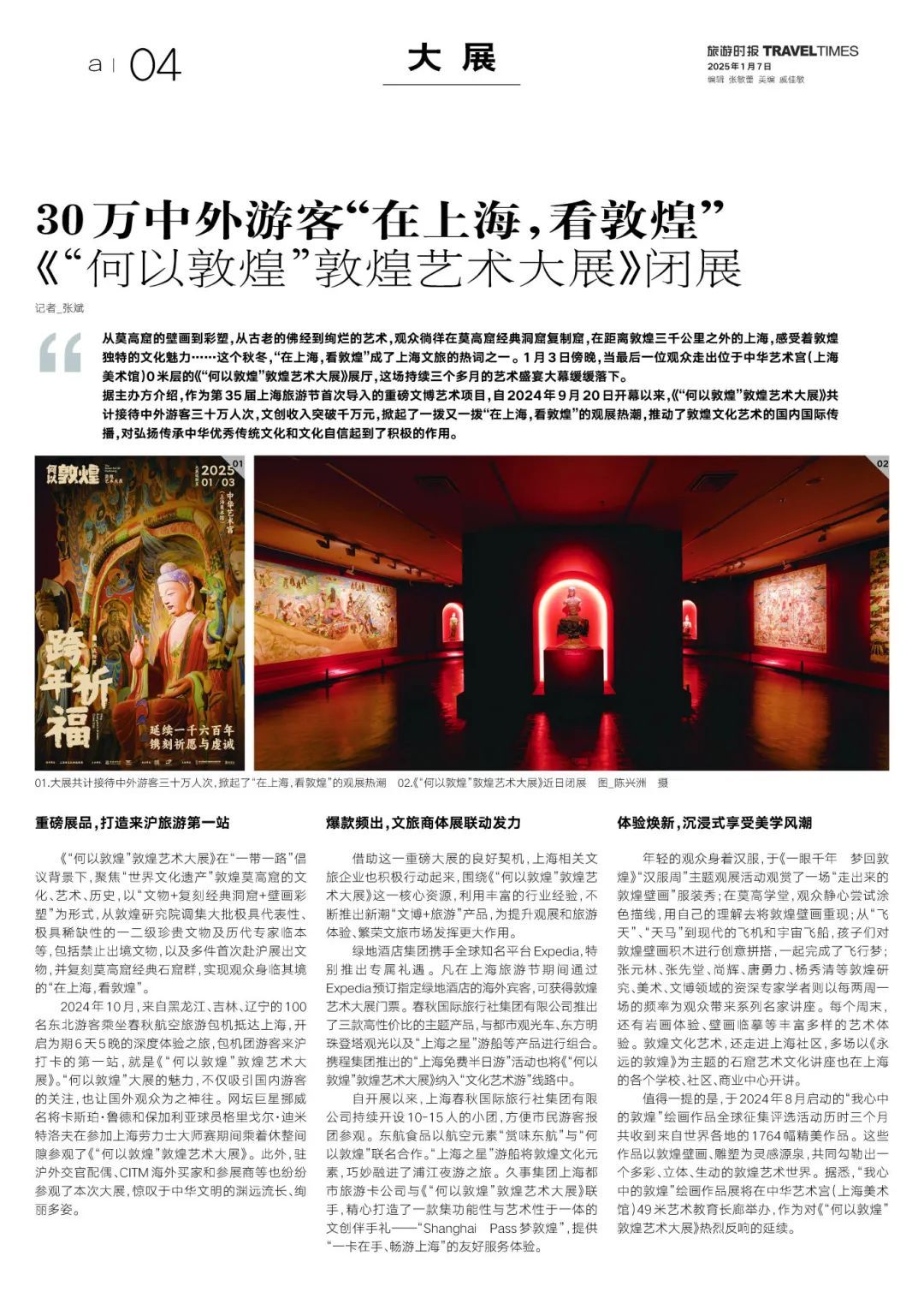 据主办方介绍,作为第35届上海旅游节首次导入的重磅文博艺术项目,自2024年9月20日开幕以来,《“何以敦煌”敦煌艺术大展》共计接待中外游客三十万人次,文创收入突破千万元,掀起了一拨又一拨“在上海,看敦煌”的观展热潮,推动了敦煌文化艺术的国内国际传播,对弘扬传承中华优秀传统文化和文化自信起到了积极的作用。