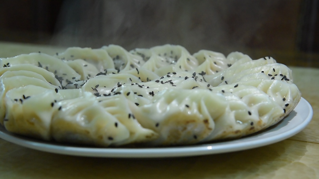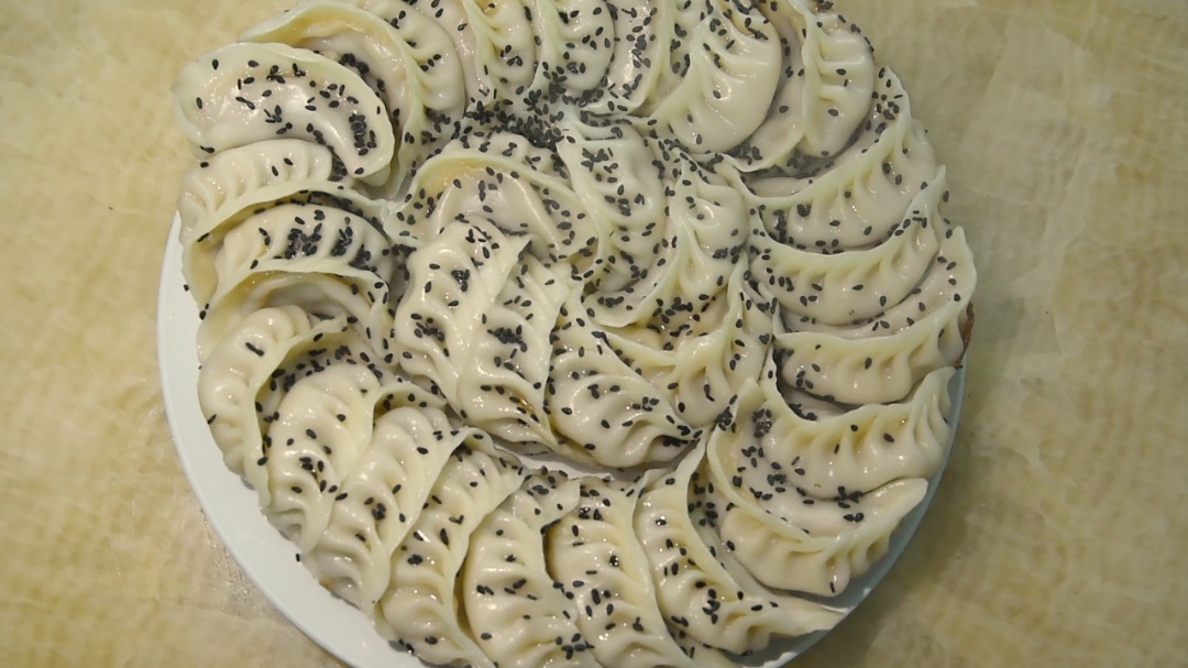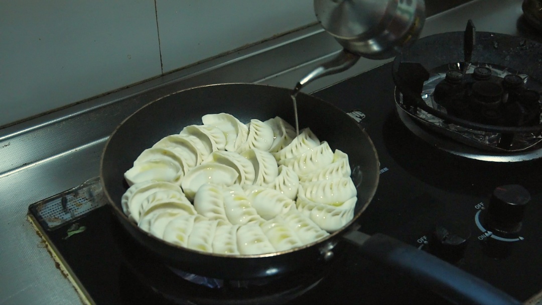 4.上锅煎饺,平底锅中倒入少量食用油,后迅速盖上锅盖,利用水蒸气使饺子内部熟透;