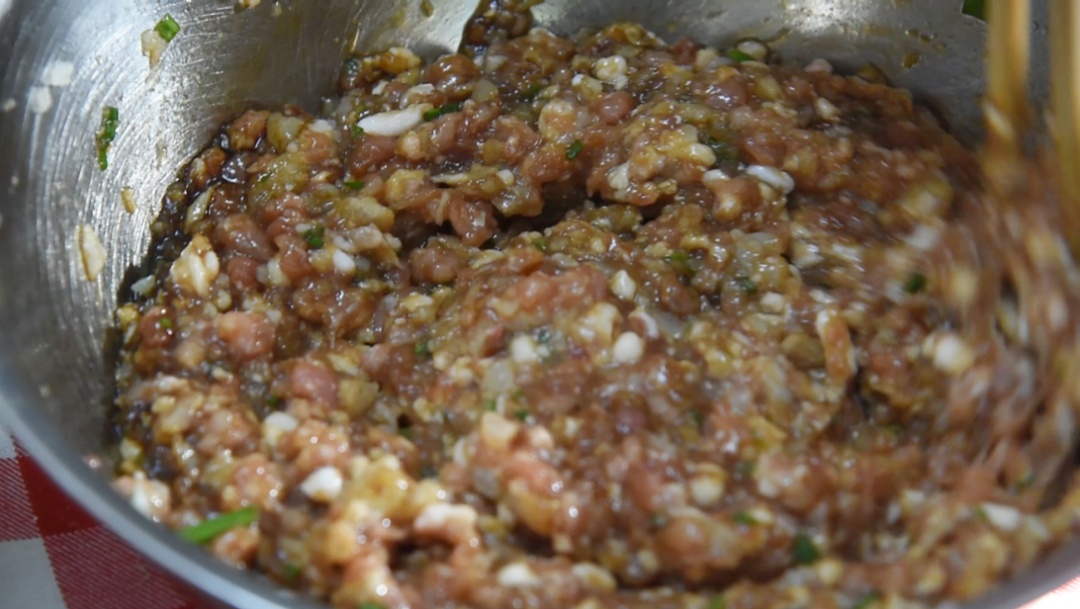 2.加入葱、萝卜泥、料酒、鸡蛋、盐、蚝油搅拌;