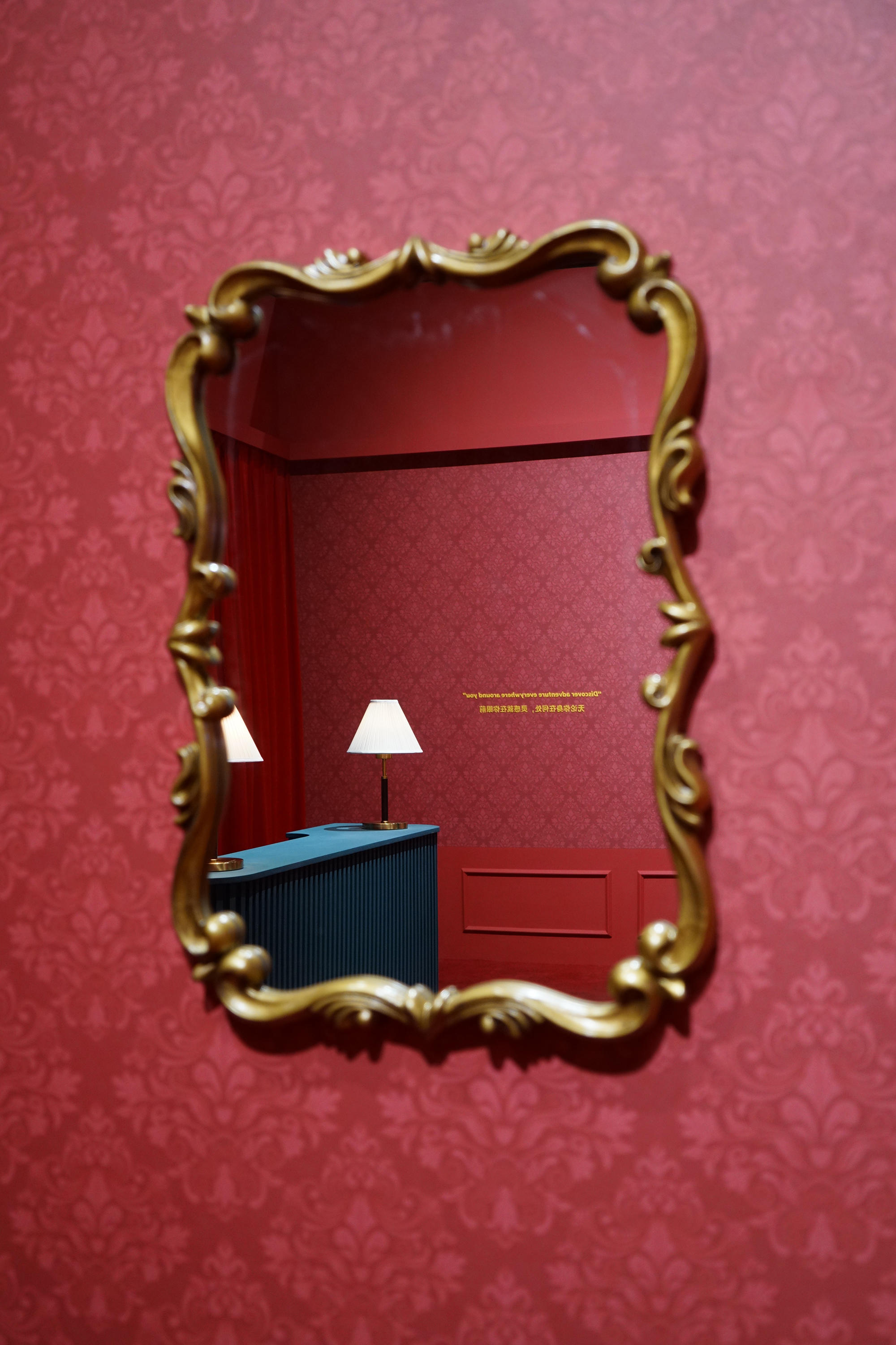 “注意间隙”展区聚焦交通工具,特别设计的火车车窗装置呼应了韦斯·安德森电影中的列车场景,成为本次展览热门拍照打卡点; “请入住”与“游泳池”两个展区则再现华丽的大堂、装饰考究的套房,以及现代游泳池与历史悠久的海滨浴场等经典电影场景,让观众置身于现实与童话之间的奇幻氛围。在“收藏色彩”展区,呈现的是见韦斯·安德森标志性的色彩语言,绿松石色和粉色的主题既传达出对特定年代的怀旧感,又蕴含着强烈的当代性。而终点“在自然里松弛”展区,通过展示远离城市喧嚣的自然景观,为观众提供了一场视觉疗愈之旅。