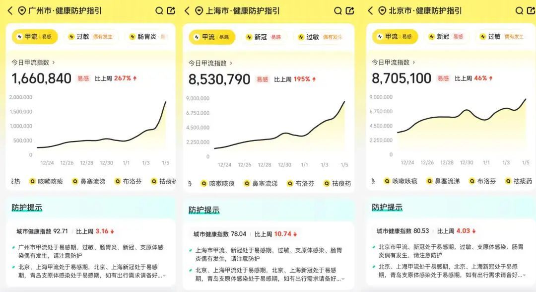 美团买药健康指数显示,1月5日,全国多地甲流指数出现上涨。从相关药品需求量来看,1月5日,美团买药奥司他韦搜索需求量周增近1倍,速福达搜索需求量周增超3倍。其中,上涨幅度较大的区域主要集中在华南、华东地区。从美团买药居家快检检出率来看,近一周以来,上海、北京、杭州三地甲流阳性检出率相对较高。其中,上海甲流阳性检出率为49%,北京甲流阳性检出率为40%,杭州甲流阳性检出率为35%。