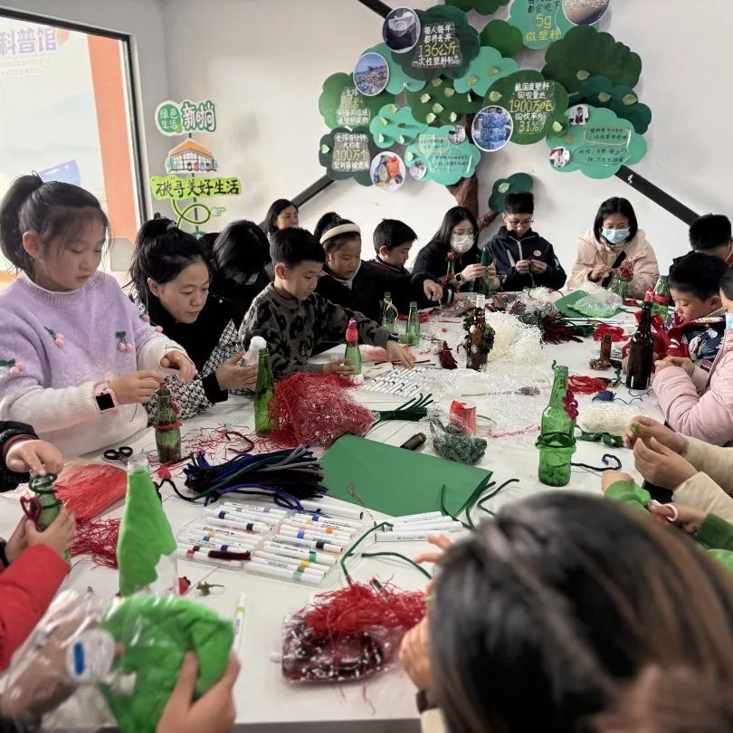 和我们一起感受环保的魅力 垃圾分类科普馆 2024手工活动鉴赏 Year-end Review Year-end Review Year-end Review Year-end Review 曾经 大家或许对垃圾分类科普存有刻板印象 如今,南桥镇垃圾分类科普馆 用实际行动告诉大家 垃圾分类科普也能如此有趣! 回望2024 科普馆研发了各类创意满满的手工课程 让“变废为宝”、 “资源回收再利用”更具象化 带领大朋友、小朋友一起 感受环保的魅力! 全息投影 科技与环保巧妙融合 还记得那些被你直接扔进垃圾桶的蛋糕外盒吗?通过全息投影原理,可以制作一个简易的类全息投影装置,让自己喜欢的动画以3D形式呈现在你眼前。 DIY环保挂件 实现挂件自由 热缩片其实蕴含着创意无限的可能,作为再加工材料的它在手工爱好者手中可以变幻出多样形态——精致的钥匙扣、个性化的饰品。 魔法生态瓶 赋予塑料瓶奇幻色彩 通过磁吸原理,让瓶中的物体(小蝴蝶、小蜜蜂)仿佛摆脱了地心引力的束缚,自由悬浮在空中。 艺术挂钟&漆扇 跟白色污染说拜拜 那些废旧广告板其实大有用途,给他点缀上贝壳或者涂上绚丽多彩的颜色,便能化身为一件艺术品。 “袋”你一起创意拼贴 环保袋与美学的碰撞 身边的环保袋除了为我们提供便利的同时,也呈现了很多美学设计,用全新的视角让它们发挥其美学价值。 太阳能电扇 了解绿色能源 绿色能源在我们生活中有着不可估量的作用,了解太阳能电池板工作原理,结合废弃用品,看看它能为我们带来什么样的奇妙体验? 艺术玻璃瓶 烛台、圣诞装饰 探索玻璃的起源,玻璃真的环保吗?小小的玻璃容器摇身一变可以成为精致的圣诞摆件,还可以做成独特的烛台,想不想来尝试一下? 《封印秋天》 其他手工课题 《贝壳塑料瓶》 《微景观盆栽》 《龙年装饰》 征集“金点子” 创意大咖们, 生活中还有很多材料 可以被赋予新的意义, 如果你们有变废为宝手工的金点子, 快来告诉我们吧! 扫描下方二维码, 上传你的创意点子, 科普馆小编将进行审阅, 被采纳的金点子 将颁发创意达人证书和环保礼品! 2025,让我们一起头脑风暴,动手实践,探索变废为宝的无限可能!