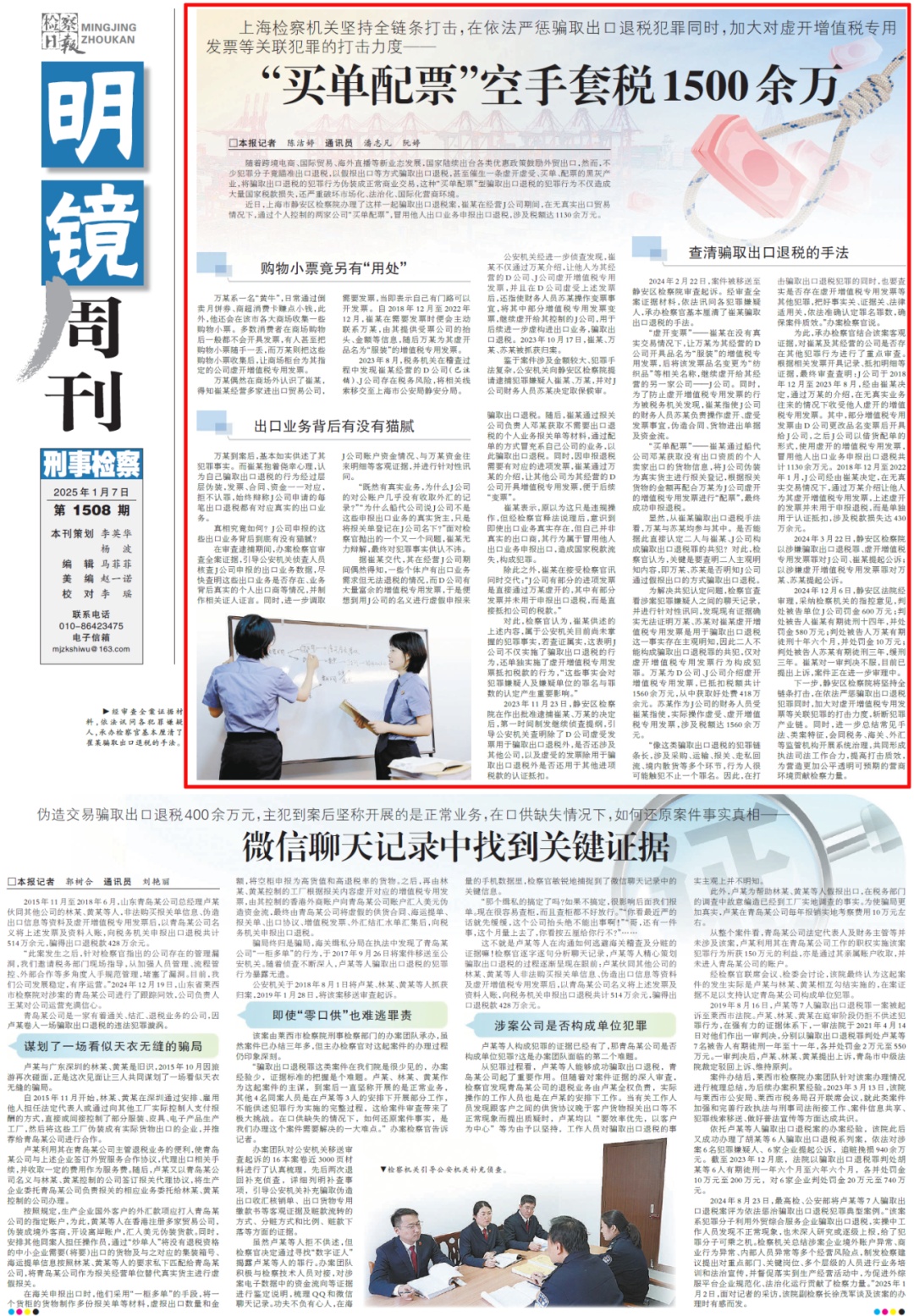“像这类骗取出口退税的犯罪链条长,涉及采购、运输、报关、走私回流、境内散货等多个环节,行为人很可能触犯不止一个罪名。因此,在打击骗取出口退税犯罪的同时,也要查实是否存在虚开增值税专用发票等其他犯罪,把好事实关、证据关、法律适用关,依法准确认定罪名罪数,确保案件质效。”办案检察官说。