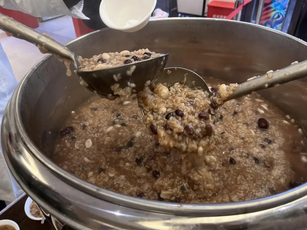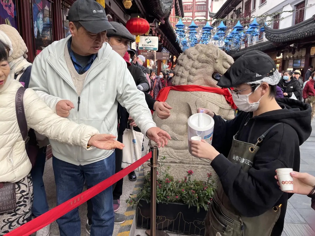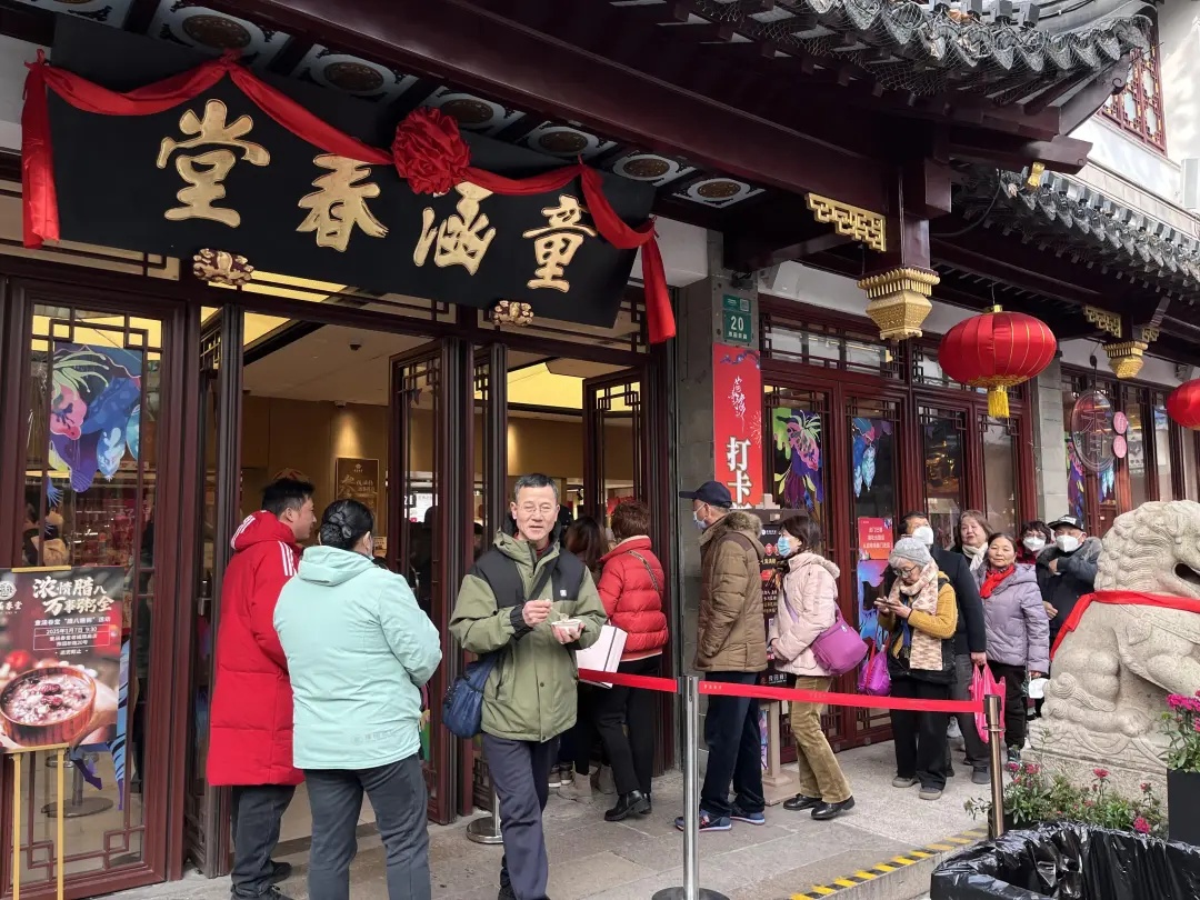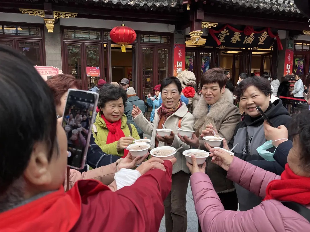 九点多,门口等待派粥的市民已经排起长队。九点半,工作人员将粥桶的盖子打开,伴随着升腾的热气,工作人员从大锅中一勺勺盛出“腊八粥”,在一声声祝福中,市民们有序排队领取,队伍中既有多年坚持过来的老朋友,还有不少慕名而来的豫园游客,对大家而言,童涵春堂的“腊八粥”不仅真材实料,味道还特别地正宗,一碗粥里满满的全是老上海记忆。