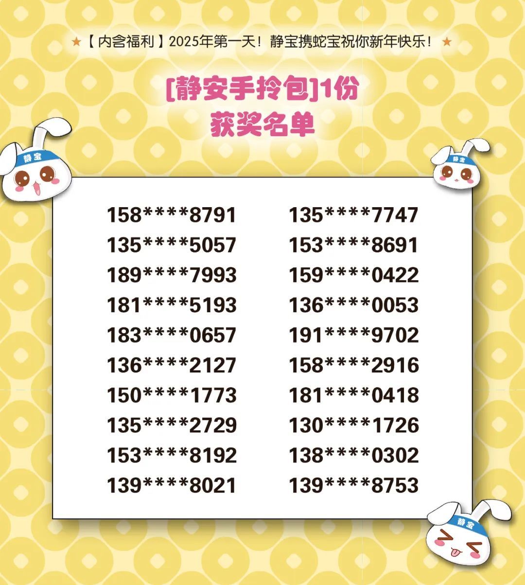 此前静宝推送的《【内含福利】2025年第一天!静宝携蛇宝祝你新年快乐!》中奖名单已经出炉!详见↓