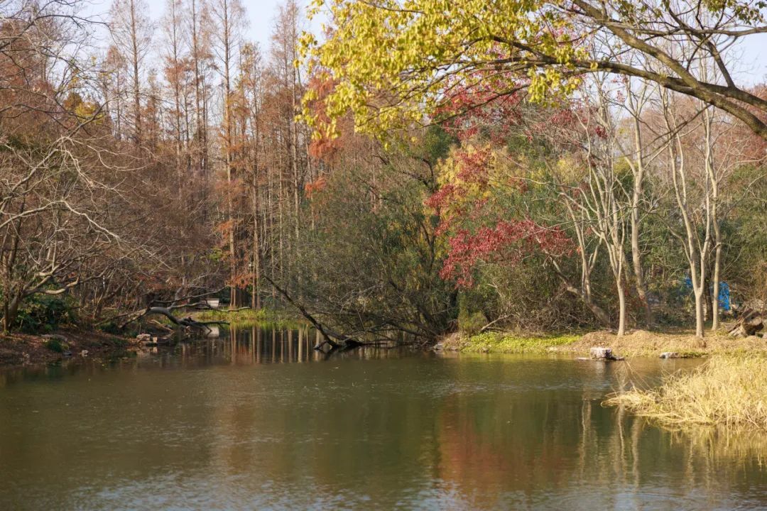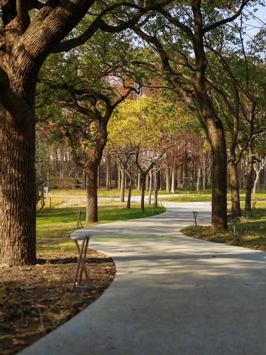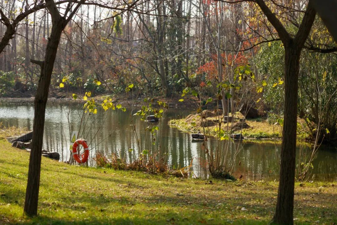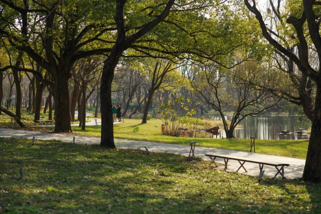 由于绿道紧邻共青森林公园,沿途的风景也别有一番天地。高大的乔木和灌木相映成趣,松柏沿路生长,步行数十米还有一汪小湖可以驻足观赏,即使是冬天依旧能感受到生机勃勃、视野开阔。