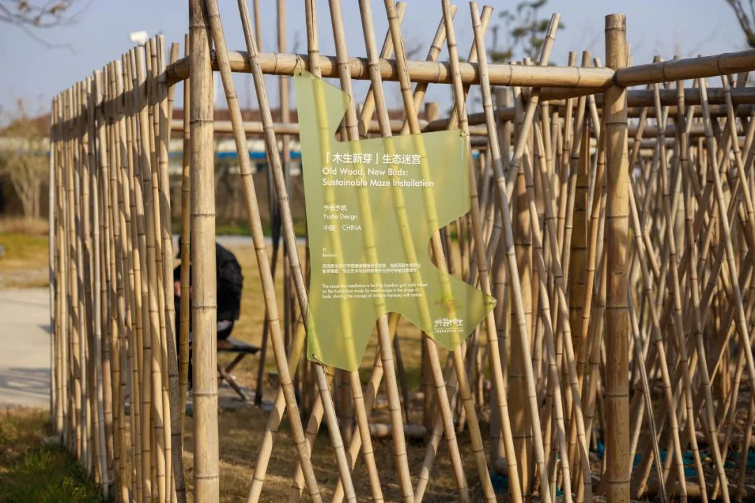 在绿道的尽头,一个由原生态竹竿搭建的“木生新芽”生态迷宫趣味十足。迷宫地面,以碎木渣拼出新芽图案,传达着艺术与自然和谐共生的可持续发展理念。
