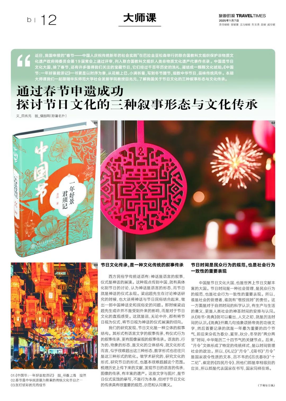近日,我国申报的“春节——中国人庆祝传统新年的社会实践”在巴拉圭亚松森举行的联合国教科文组织保护非物质文化遗产政府间委员会第19届常会上通过评审,列入联合国教科文组织人类非物质文化遗产代表作名录。中国是节日文化大国。除了春节,还有许多值得我们关注的宝藏节日,它们经过千百年历史的洗礼,凝结成一颗颗文化琥珀。《中国节:一年好景君须记》一书更是以时序为章,从花朝上巳、小满祈蚕,写到冬节腊节,细数中华节日,品味传统风华。本期大师课我们一起跟随华东师范大学社会发展学院教授田兆元,了解我国关于节日文化的三种叙事形态与文化传承。