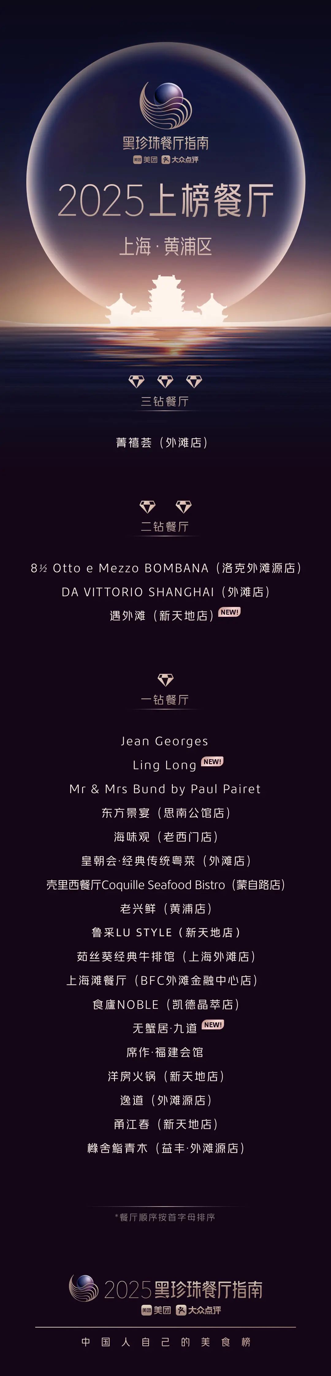 1月6日,聚拢了中国高品质标杆餐饮品牌的“黑珍珠餐厅指南”迎来了第八年发布,全球共有34个城市的370家高品质餐厅上榜。在2025黑珍珠餐厅指南中,上海共上榜61家餐厅,其中,黄浦上榜餐厅共22家,占上海上榜餐厅总量的36.1%,其中三钻餐厅1家,二钻餐厅3家,一钻餐厅18家。