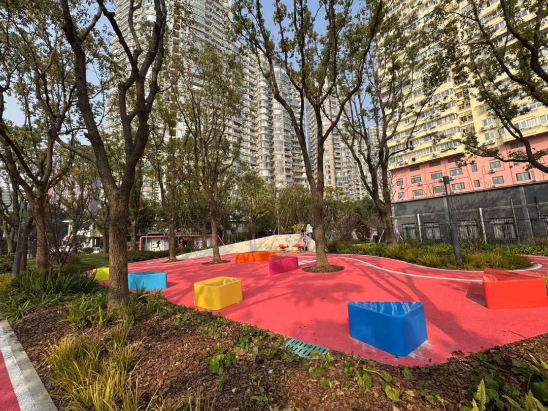 在半淞园路苗江路的一处口袋公园里,以“共享·活力·无界”为主题的数个类似“七巧板”造型的座椅,一下子让这个共享公共空间明亮了起来。