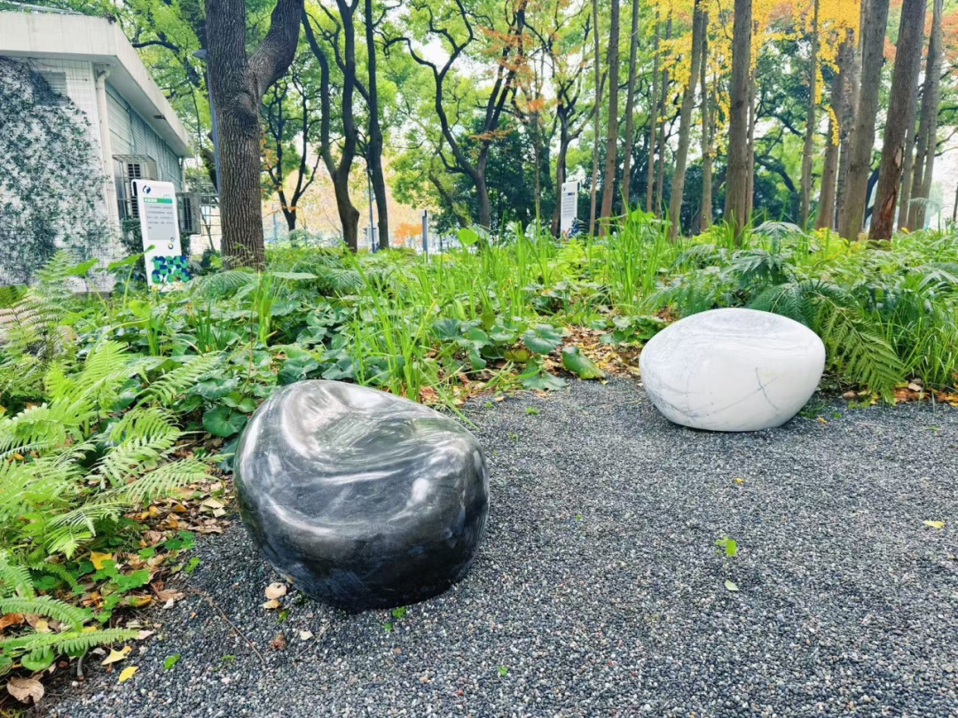 最近,“棋”造型的座椅在森邻花园亮相了。座椅由整块原石打磨而成,呈椭圆状,顶面略凹,色泽温润、纹理自然,既方便乘坐,又保留了自然石材的质朴与美感,掩映在水杉树下、孢子植物中,与万物生灵融合在一起,仿佛成为了大自然的一部分。
