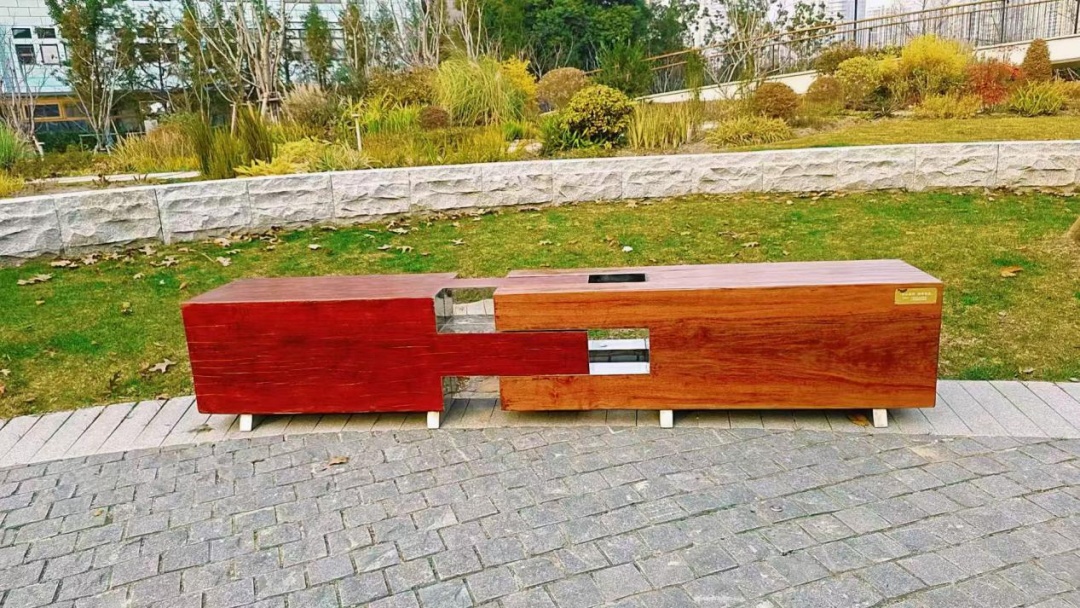 座椅与花园“木”元素的设计理念充分融合,材质选用柳桉木和不锈钢,榫卯结构面采用镜面效果,与绿地的树影、木影、光影相互交汇、掩映、融合,让市民游客在此驻足休憩时,既能感受自然的林荫景观,又能透视南外滩百年历史演变。