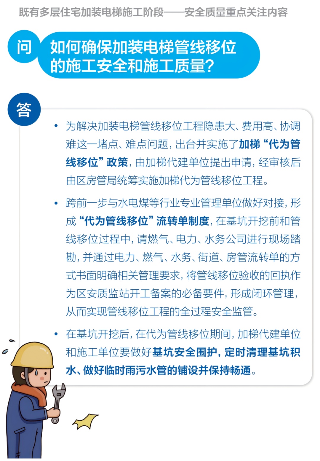 加梯管线移位、加梯土建工程、轿厢安装时加梯施工阶段的重要环节。本篇章重点向居民介绍加梯代为管线移位政策,以及加梯土建、加梯轿厢的安全质量监管。