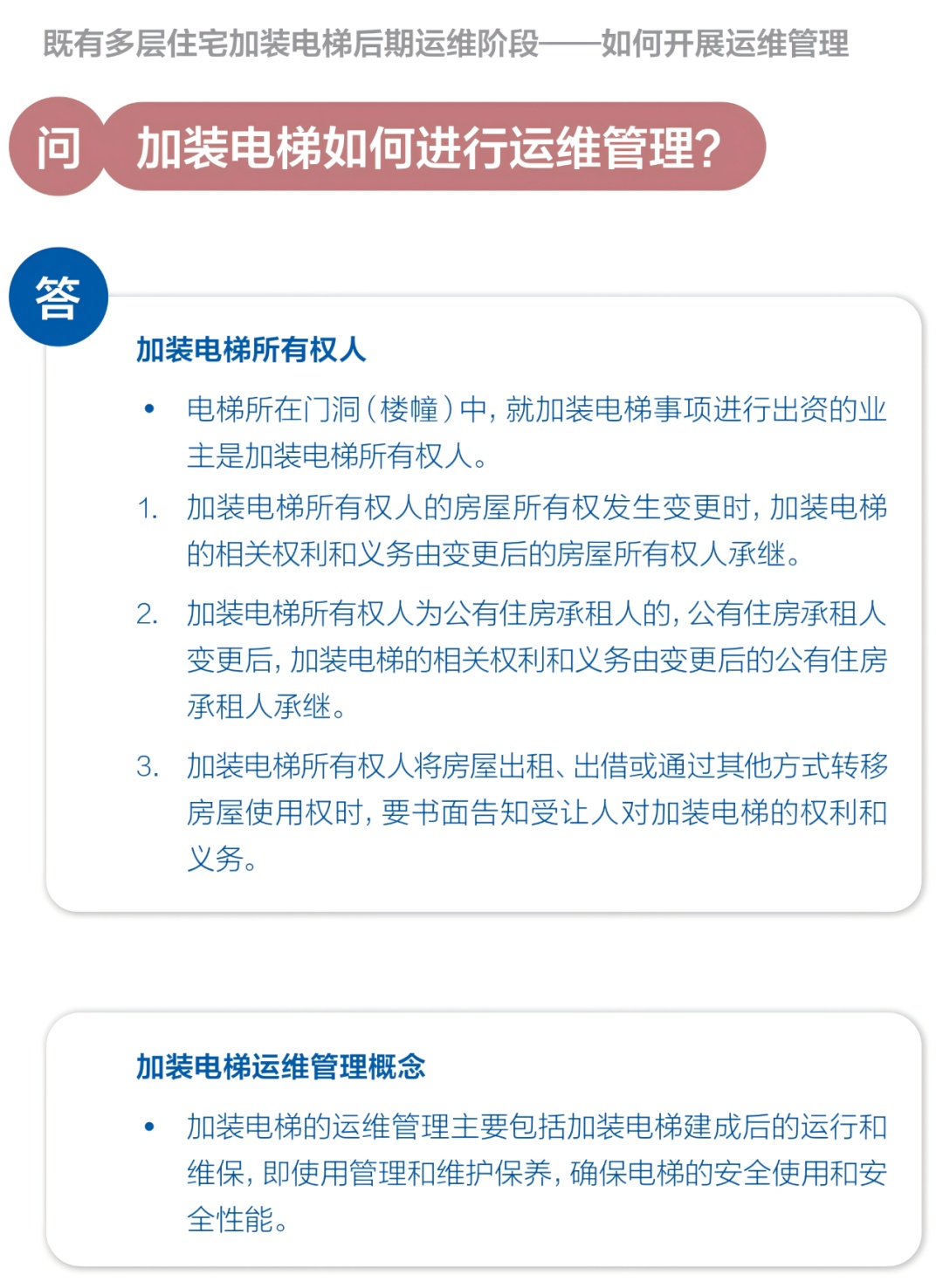 电梯运维管理是确保加梯正常运行的重要保证。本篇章对开工前严格落实加装电梯“两征询、两方案、两经费”、做好“二协议”运维管理委托、运维资金的筹措途径等问题详细进行解释说明。