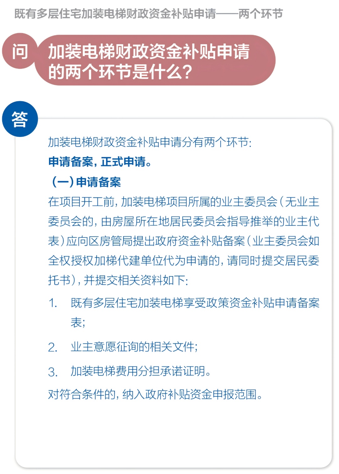 《关于本市既有多层住宅加装电梯办理政府补贴资金有关事项的通知》(沪财建【2020】28号)规范了加梯政府补贴资金的申请和使用管理。本篇章对加梯财政资金补贴申请流程和要件详细进行解释说明。
