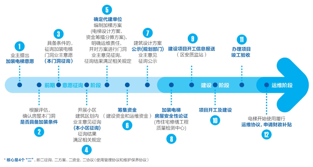 加装电梯的基本流程可以分为前期阶段、施工阶段、运维和资金补贴阶段。核心是四个“二”,即“二征询、二方案、二资金、二协议”。本篇章将加梯的基本流程和重要节点一目了然地呈现给居民。